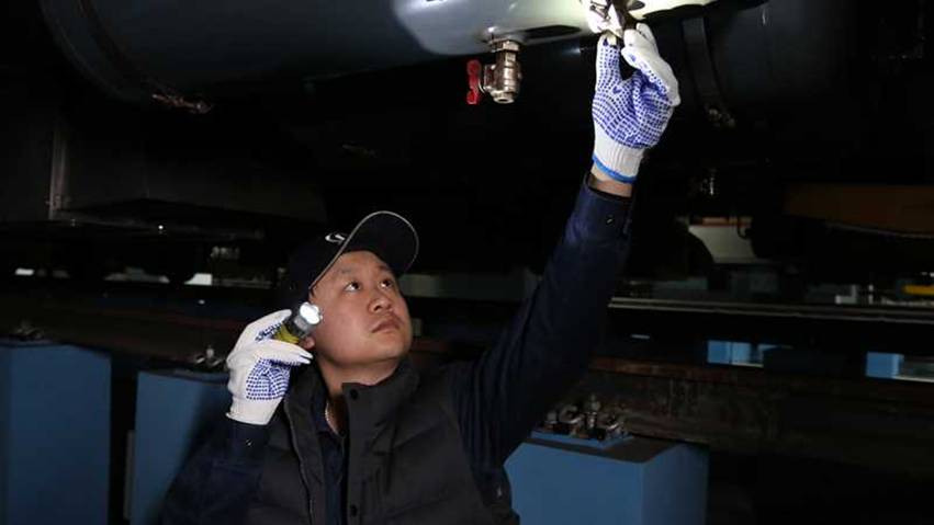 车辆检修工对车下风缸进行检查