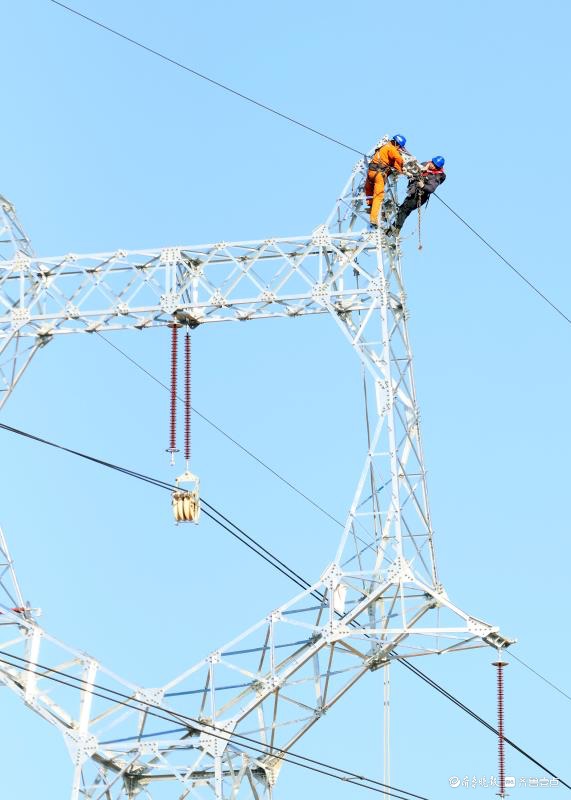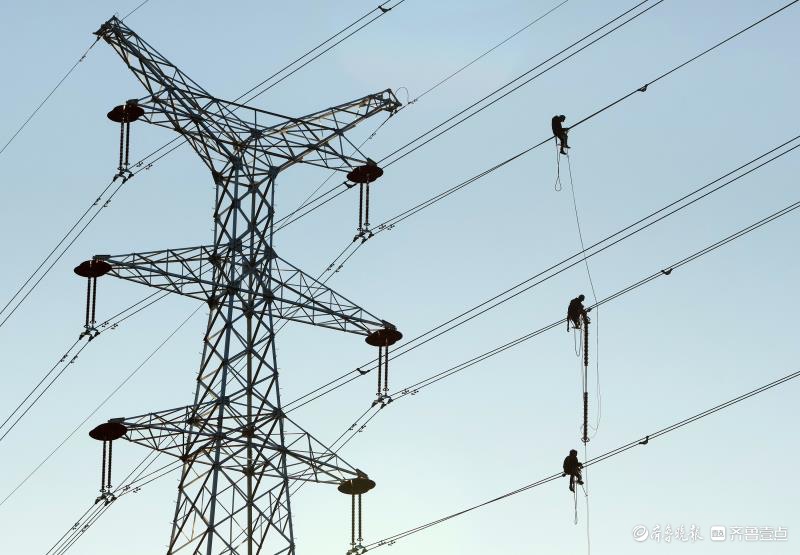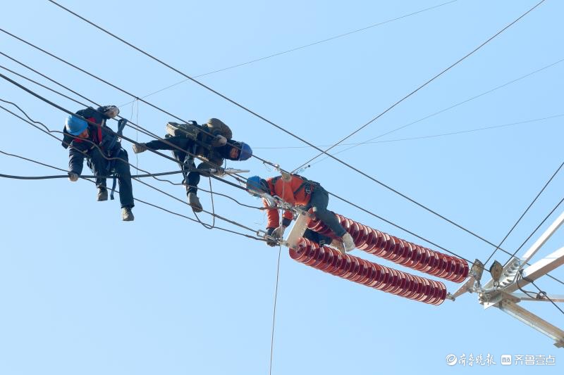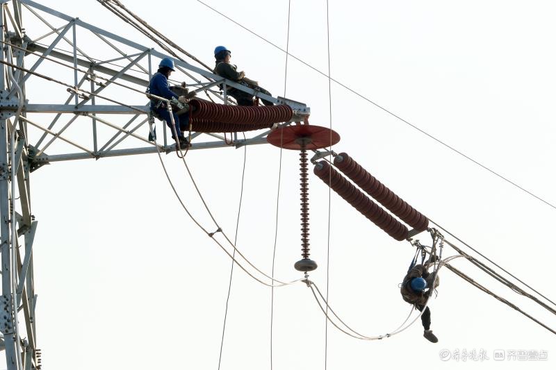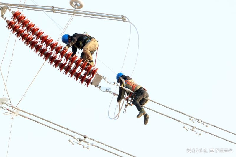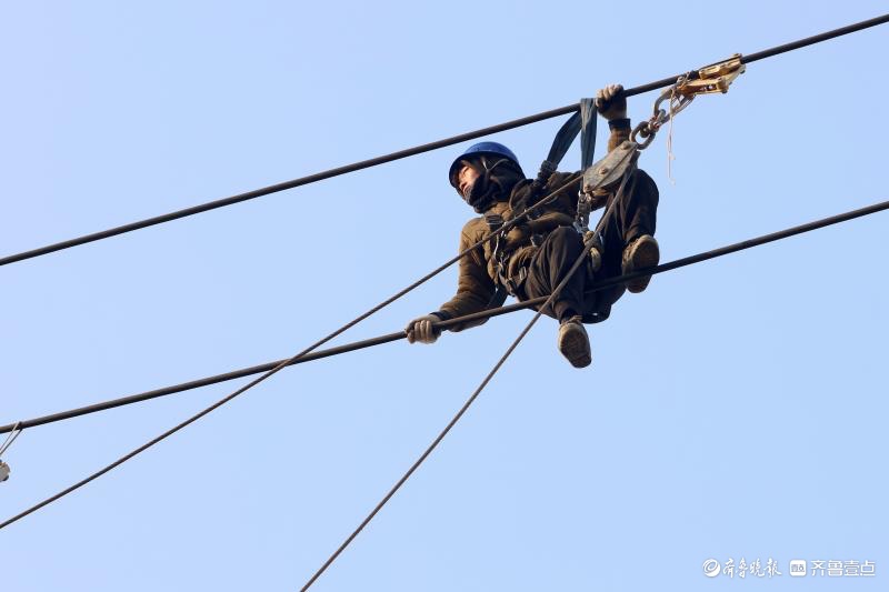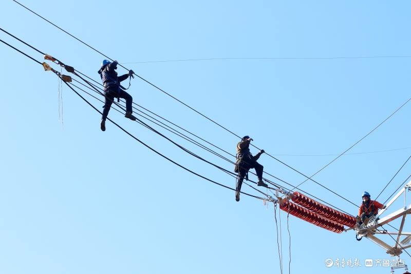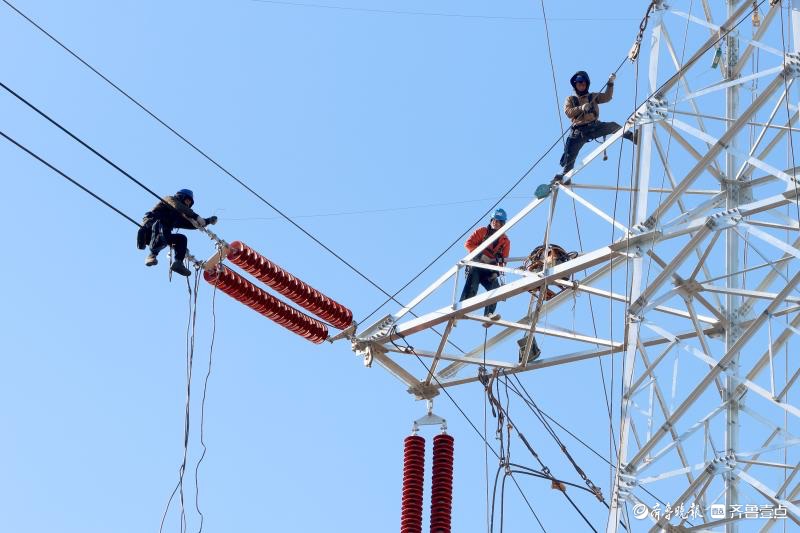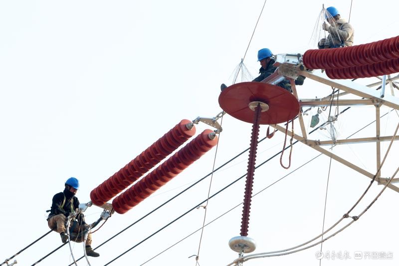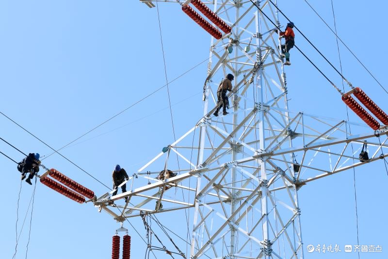 2025年12月24日,在菏泽市牡丹区皇镇街道办事处,一座座高耸入云的铁塔整齐有序地排列在田地里。电力工人不顾严寒,在六七十米高的线路上高空作业,对220千伏线路铁塔进行改造施工。