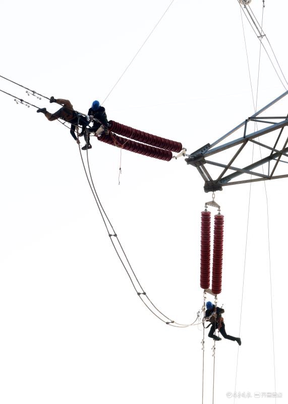 电力架线工人是国家基础设施建设的基石,他们的身影是铁塔银线与广袤天地间最动人的风景。他们的工作看似沉默,却点亮了城市的璀璨,驱动了工厂的运转,温暖了每一个家庭的夜晚。他们用汗水、勇气和专业技能,守护着经济社会发展的生命线,是真正在云端“编织”光明的无名英雄。他们时而蹲坐时而站立,时而趴着时而悬空,在高空演示着蓝天之“舞”。我用200毫米的长焦镜头,记录下这群光明使者的最美“舞姿”。 刘心中 摄