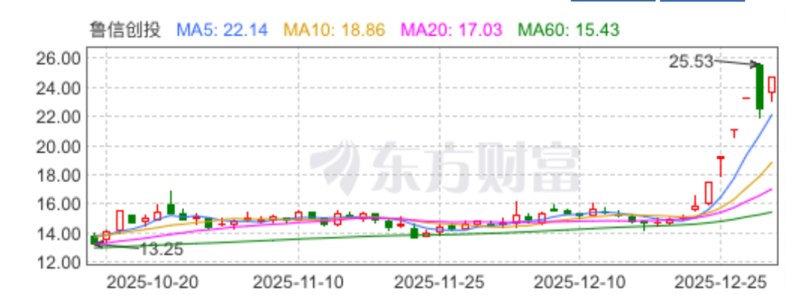 数据显示,自12月24日起,鲁信创投股价开启快速拉升模式,6个交易日内斩获5个涨停板,累计涨幅高达56.03%,累计换手率达41.64%。截至12月31日A股收官,公司股价收报24.73元每股,当日再度以10.01%的涨幅封死涨停。