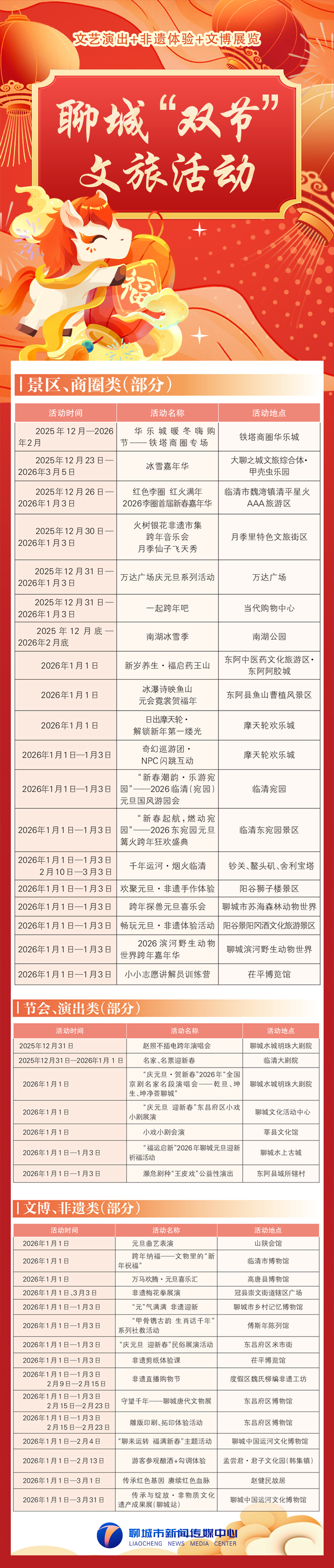 聊城市近期精心策划并推出了一系列涵盖节会演出、文博展览、非遗体验等类型的文旅活动,活动时间从2025年12月持续至2026年3月,旨在丰富市民与游客的元旦、春节假期文化生活,营造喜庆祥和的节日氛围。