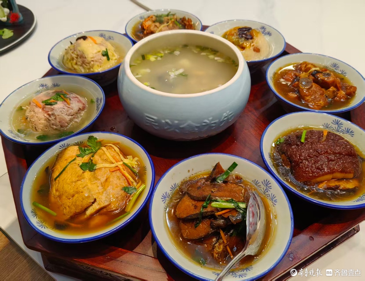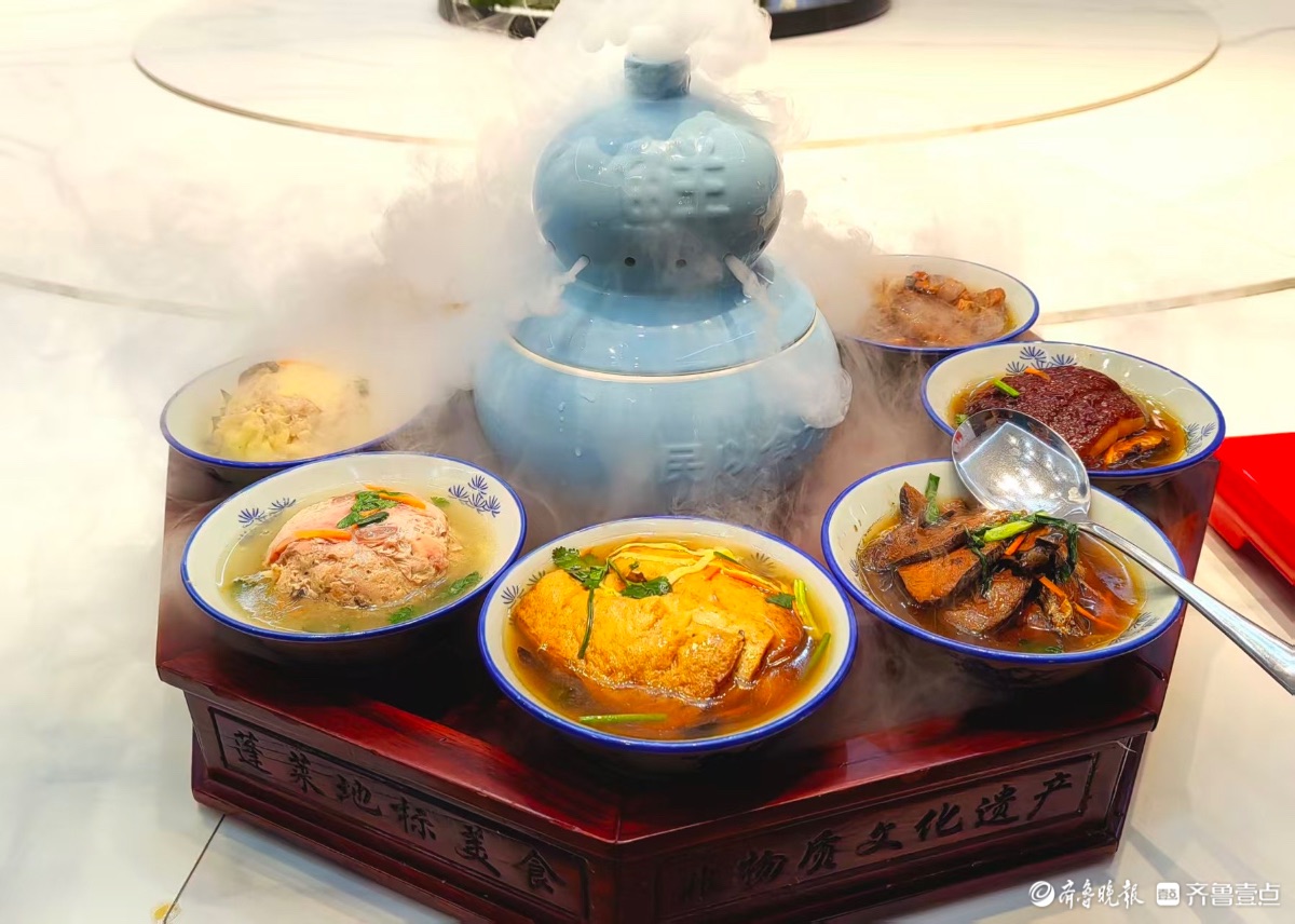 蓬莱八鲜碗,是胶东饮食文化里的非遗瑰宝,更是蓬莱人宴席上的重头戏。这组佳肴以海味与鲁菜技法相融,每一碗皆是匠心之作:清鲜的狮子头浮于汤中,软嫩的蛋包肉裹着鲜香,红烧肘子色泽红亮肥而不腻,焖烧鲅鱼带着渤海的咸鲜,还有甜糯的八宝饭解腻增味。瓷碗盛着山海滋味,蒸汽氤氲间,既有渔家的豪爽,又藏鲁菜的精细,一口咬下,是蓬莱的风土,也是代代传承的饮食记忆。王平摄