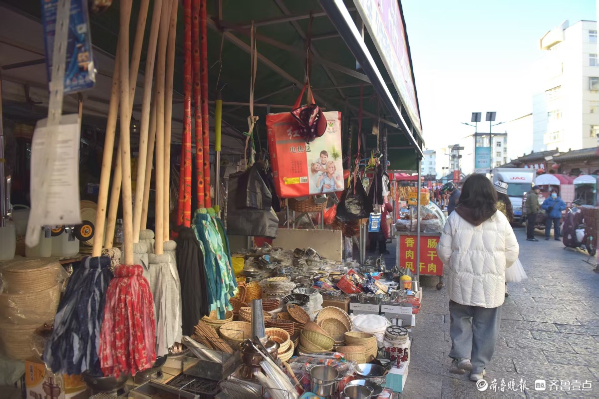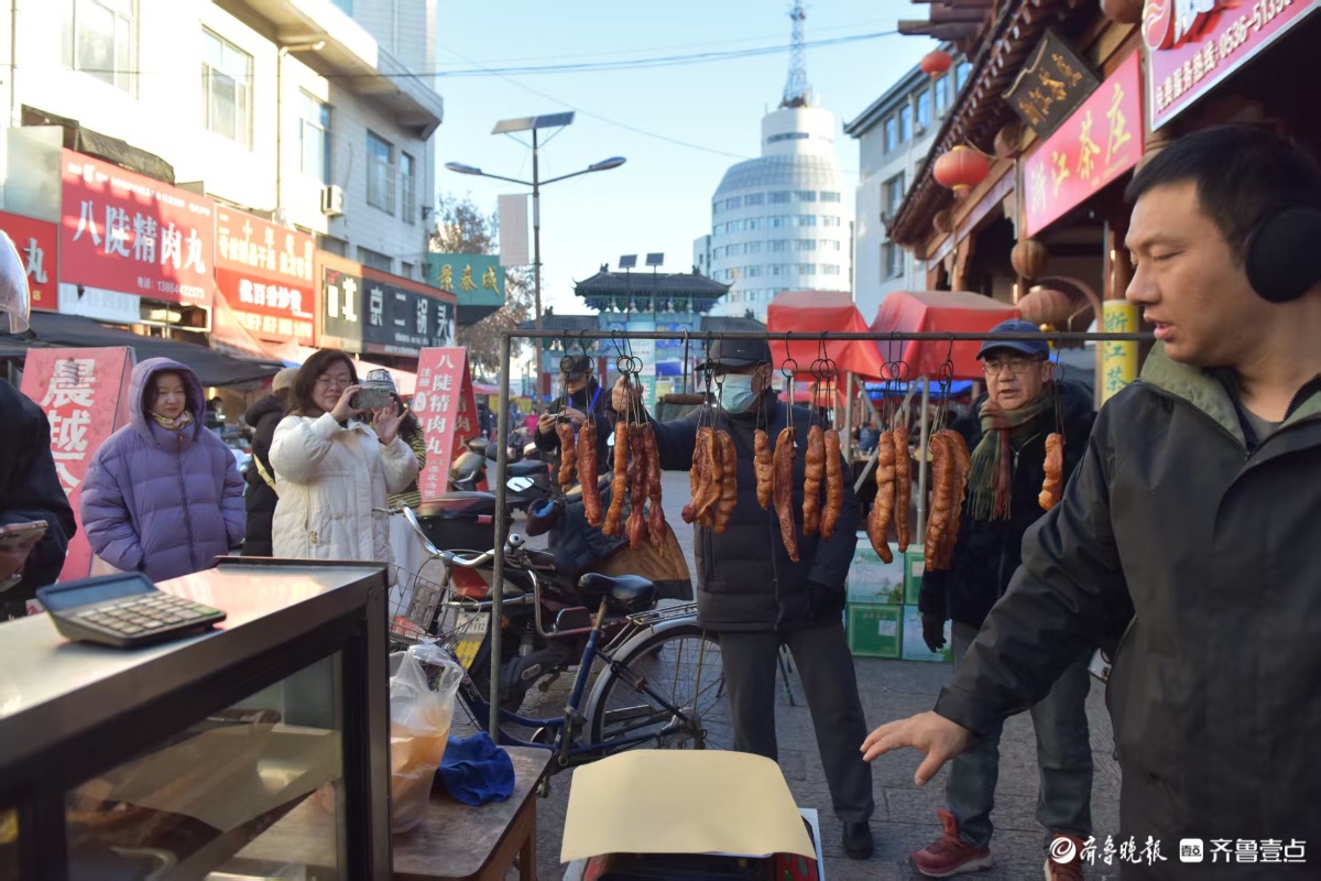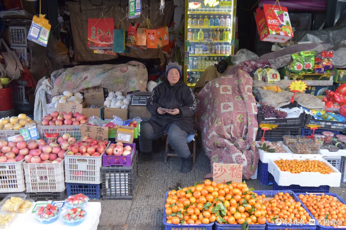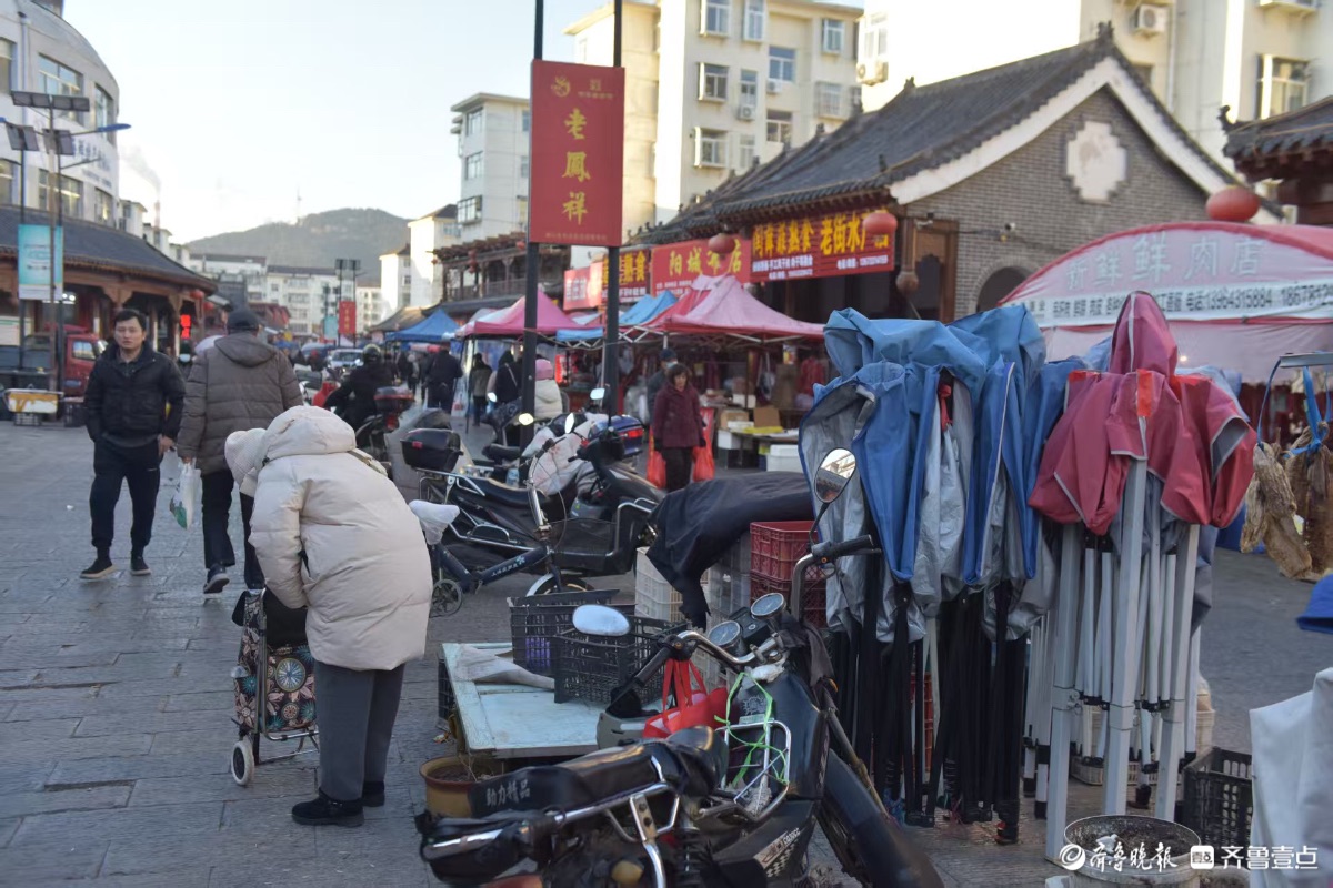 博山大街的牌坊下,市井烟火气扑面而来。红亮的香肠悬在竹竿上,肉摊老板麻利地分割着鲜肉,竹笼里的公鸡昂首啼鸣,水果摊上砂糖橘和苹果堆成了小山。行人穿梭在摊位间,有人对着熟食柜扫码付款,有人蹲在小吃摊前捧着热汤,还有老人在年货摊前挑着春联日历。老物件、生鲜果蔬、特色小吃挤在街巷里,声声叫卖与往来的脚步声交织,把冬日的博山大街,烘得暖融融的。王平摄