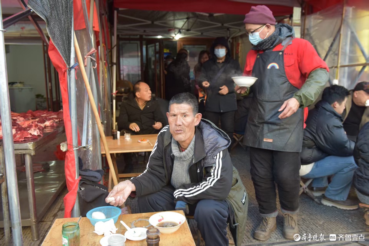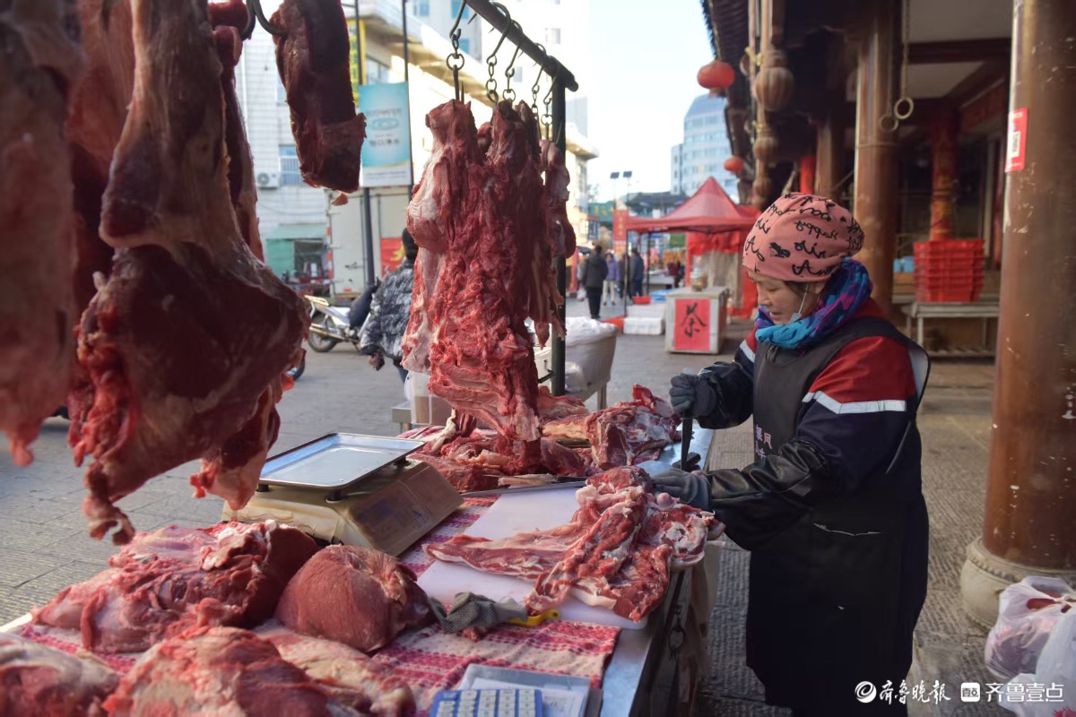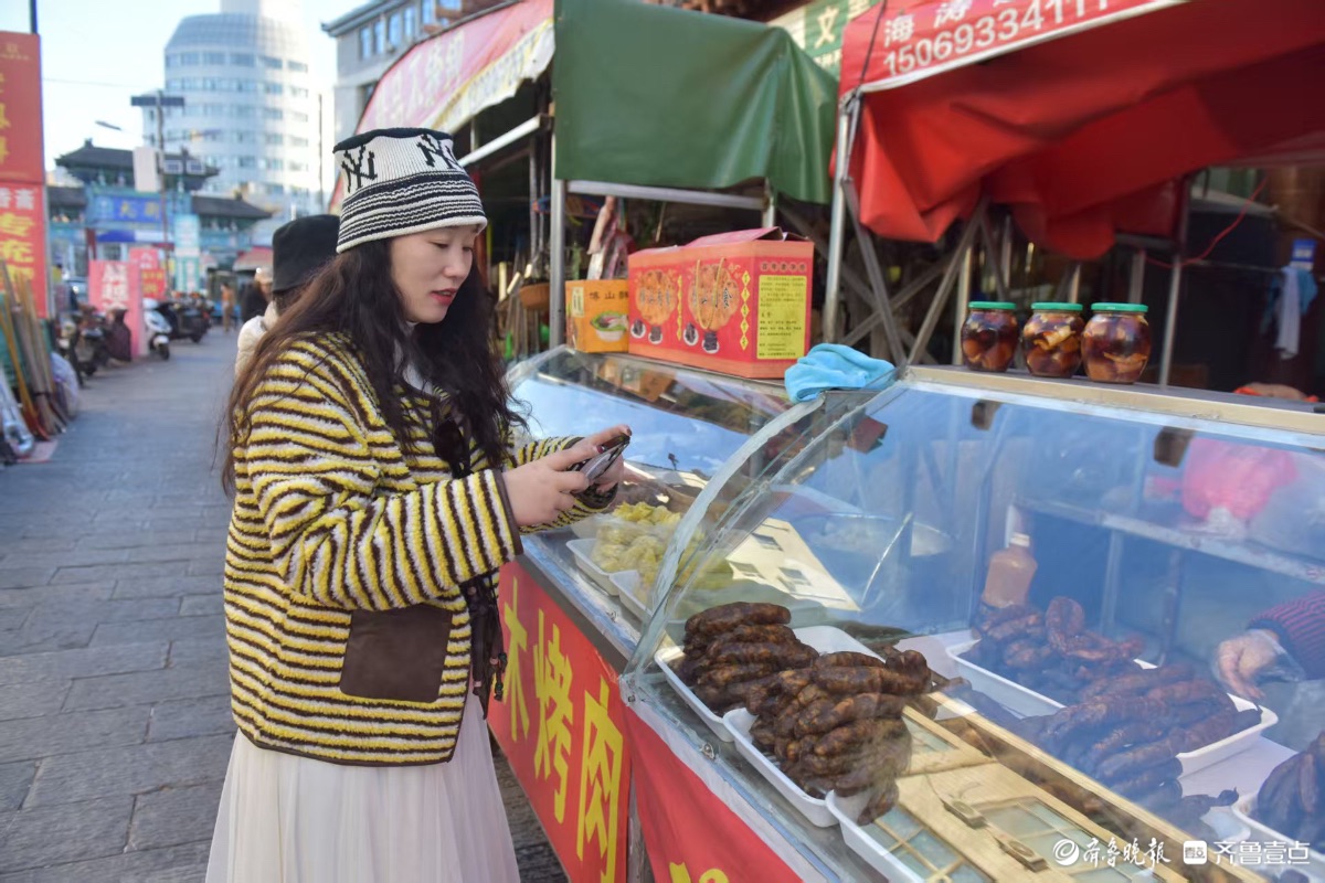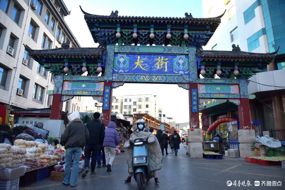 博山大街的牌坊下,市井烟火气扑面而来。红亮的香肠悬在竹竿上,肉摊老板麻利地分割着鲜肉,竹笼里的公鸡昂首啼鸣,水果摊上砂糖橘和苹果堆成了小山。行人穿梭在摊位间,有人对着熟食柜扫码付款,有人蹲在小吃摊前捧着热汤,还有老人在年货摊前挑着春联日历。老物件、生鲜果蔬、特色小吃挤在街巷里,声声叫卖与往来的脚步声交织,把冬日的博山大街,烘得暖融融的。王平摄