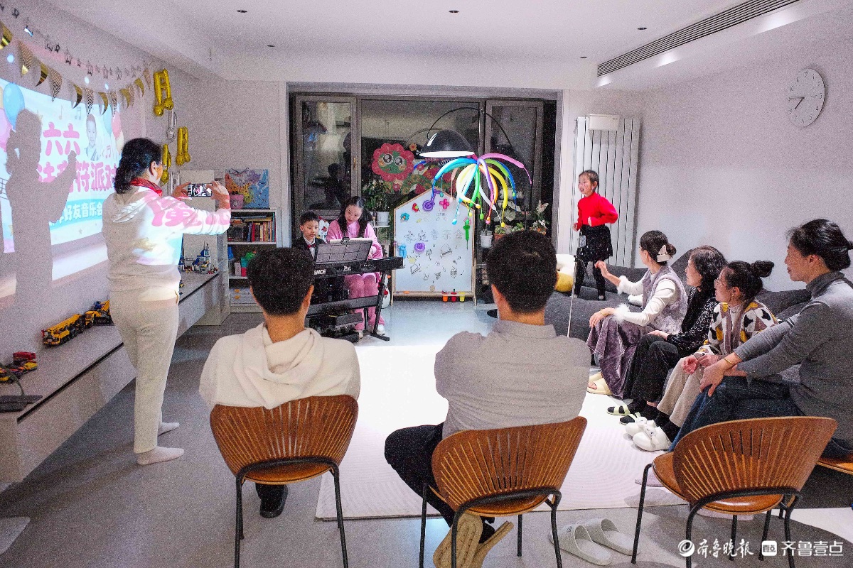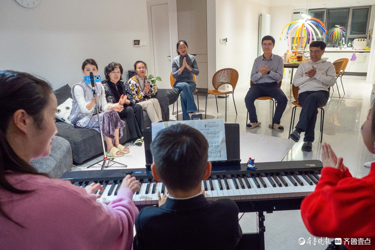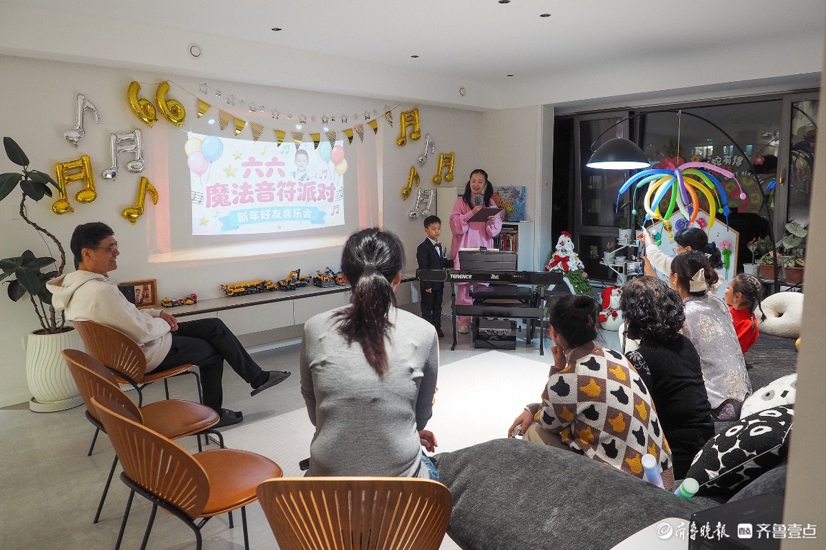 12月31日晚,在济南五岁半的六六家中,一场“魔法音符”主题新年音乐会温馨启幕。客厅饰满音符气球与星星拉花,六六身着小西装,与钢琴老师郑爽合奏《新年好》等五首曲目,稚嫩旋律让亲朋好友们笑意满盈。王剑摄