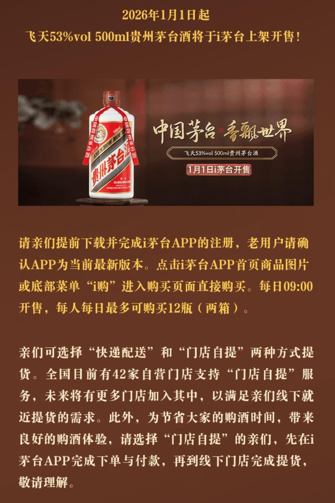 这是茅台自2022年推出i茅台平台以来,首次将核心大单品飞天茅台纳入直销体系,每人每日限购12瓶,每日上午9时准点开售。