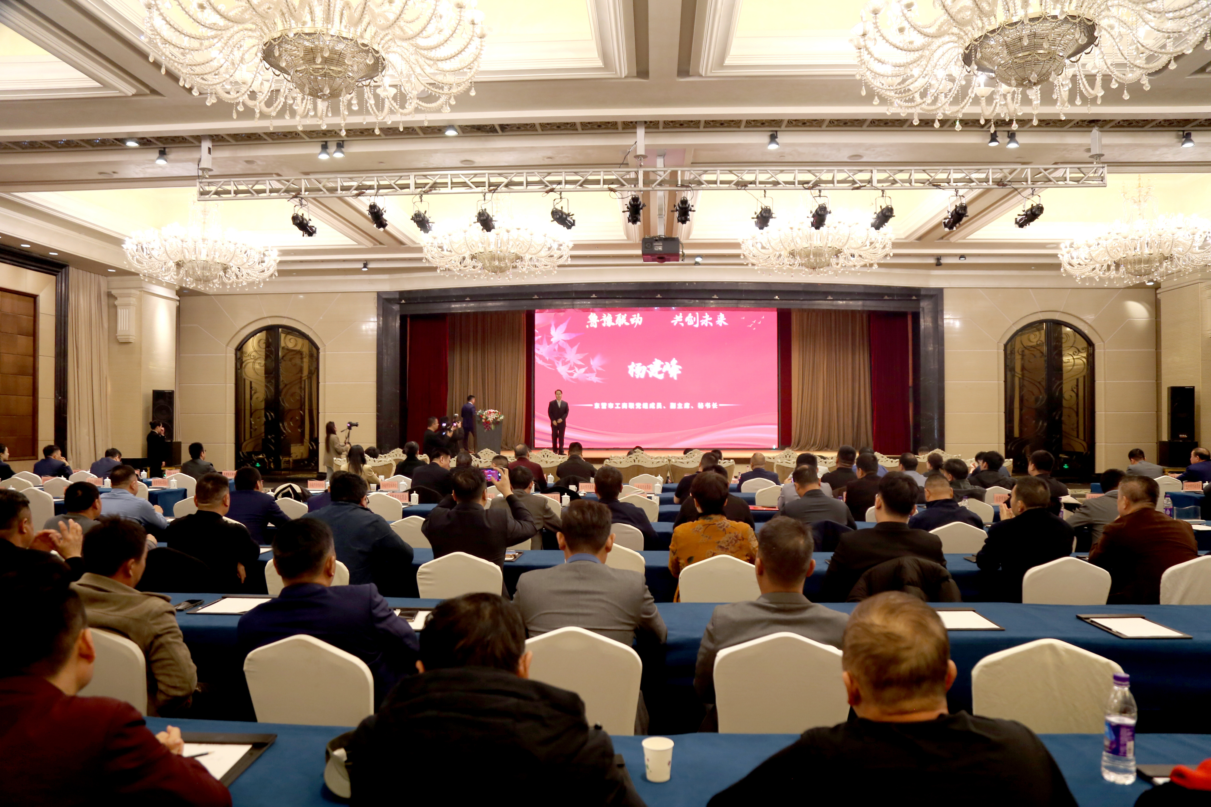 会议在庄严热烈的氛围中拉开帷幕。东营市工商联党组成员、副主席、秘书长杨建峰首先致辞,他对与会嘉宾的到来表示欢迎,并强调商会在推动两地经济交流、服务企业发展中的桥梁作用。