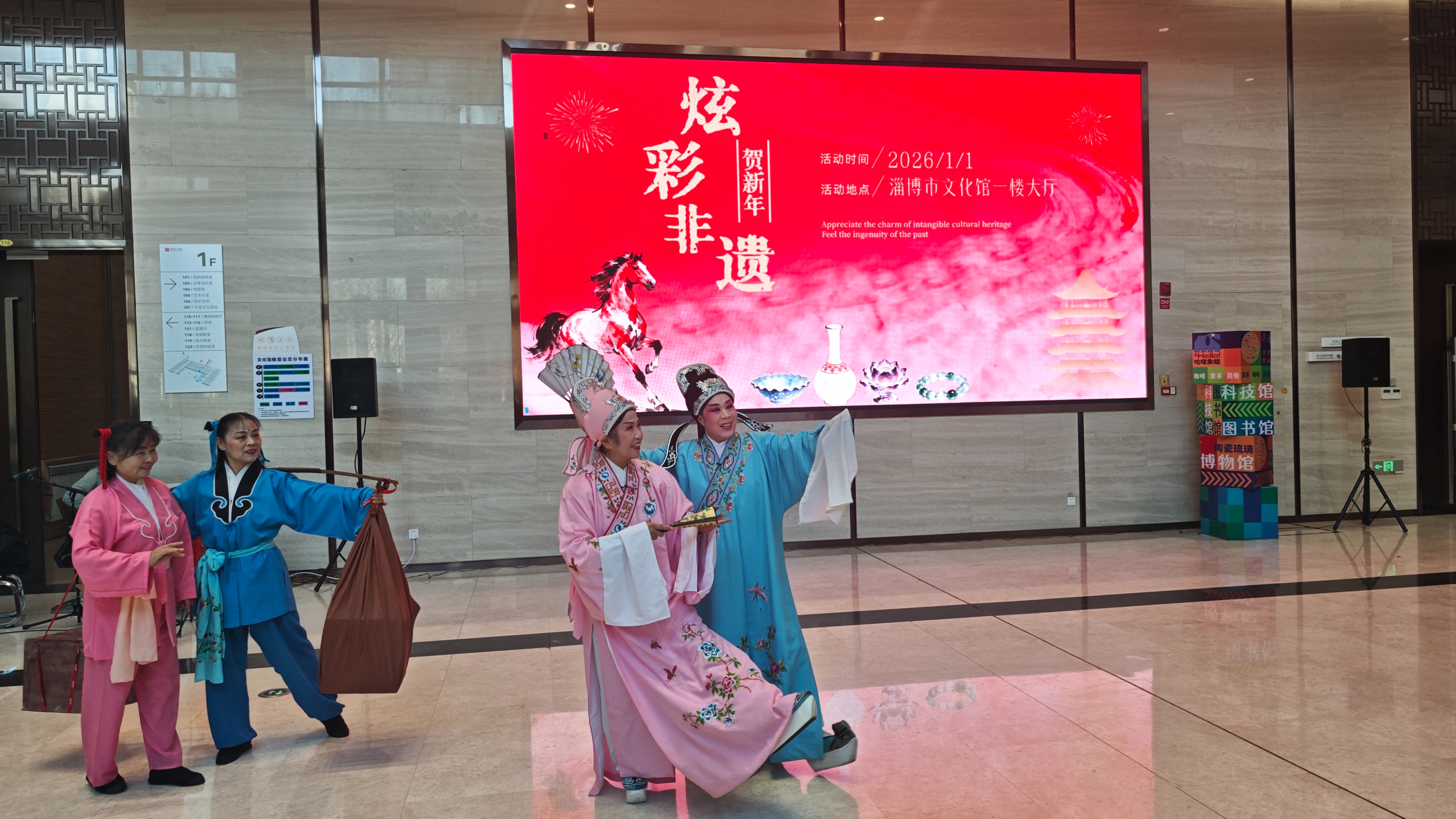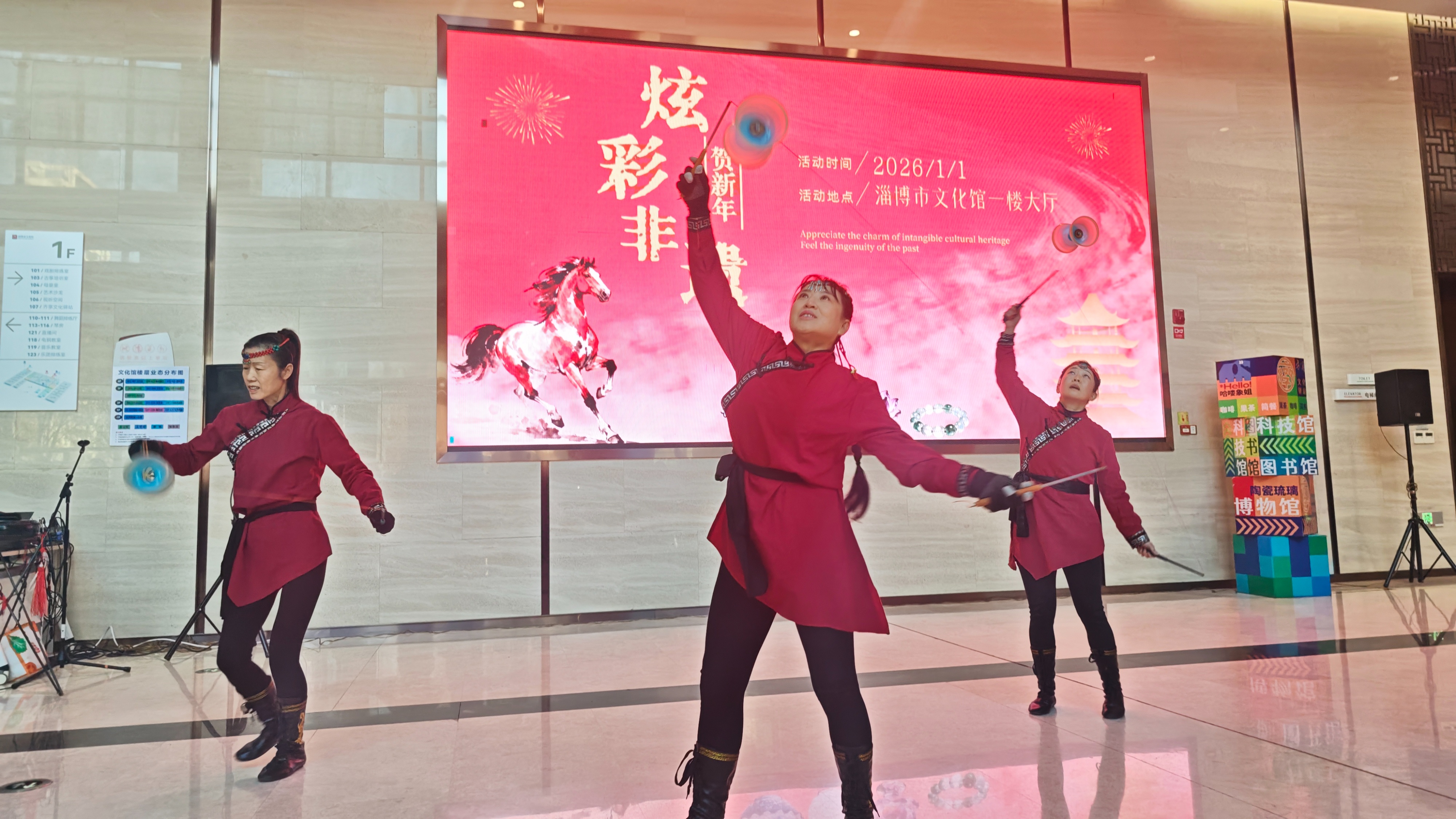 2026年1月1日上午,淄博市文化馆一楼大厅热闹非凡,“炫彩非遗”贺新年活动在此精彩上演。抖空竹的活力翻飞、榆林腔的婉转深情、古筝的清雅韵律、木板大鼓与快书的酣畅演绎……一场汇聚多元非遗技艺的盛宴,伴随市民迎接充满希望的新年。