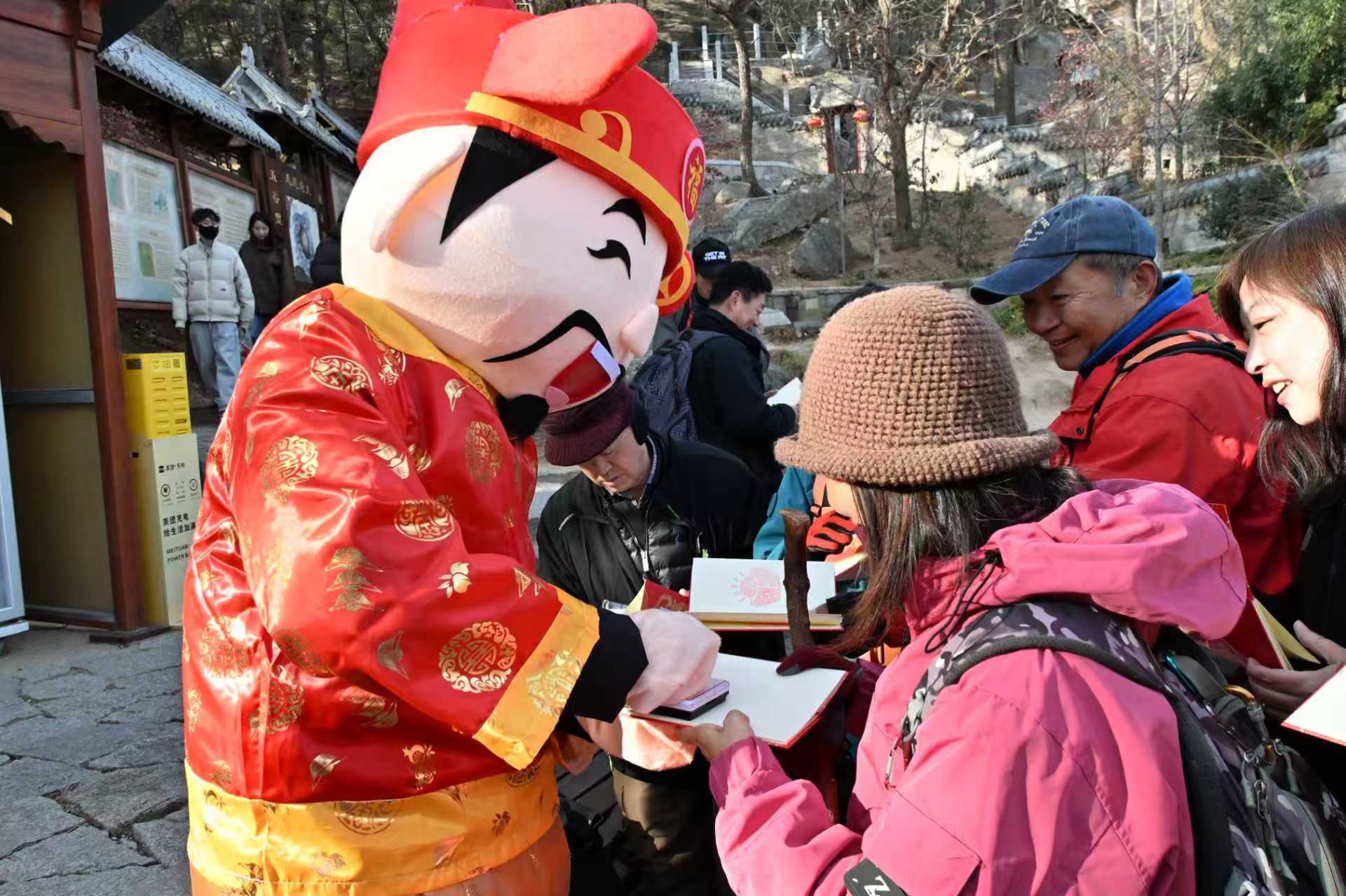 据悉,活动现场的“福禄寿财·欢聚崂山”沉浸式剧游成为一大热点。游客领取“祈福文牒”后,化身“寻寿集福”的崂山有缘人,在登山途中与“财神”“福仙”“寿老”“禄星”四路吉祥意象NPC互动,打卡华盖迎宾、太平广场、寿字峰、索道上站四大点位,完成吉祥语对答、福字闯关、挂祈愿卡、猜灯谜等趣味任务,集齐“福禄寿财”四枚印记,最终兑换寓意吉祥的王哥庄特色面鱼,沉浸式的互动体验让登山祈福之旅充满乐趣。