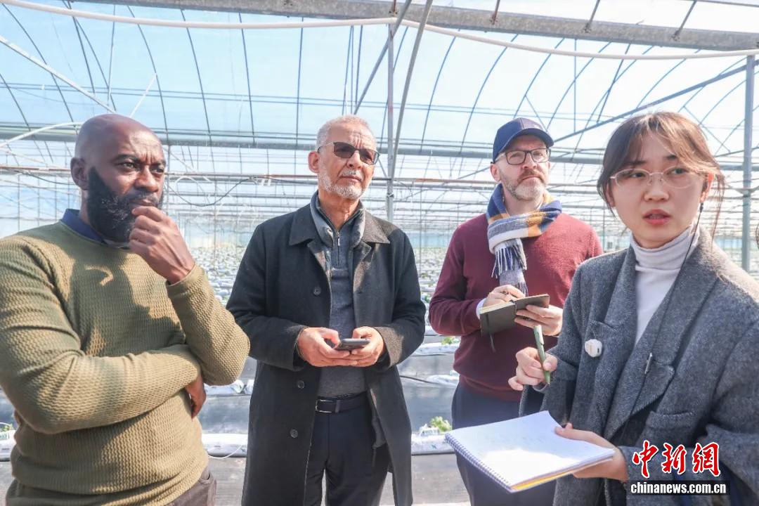 2025年11月21日,穆罕默德·曼苏里(左二)跟随“人权行动看中国·2025”江西行活动参访团来到赣州市于都县潭头村的蔬菜大棚基地,了解富硒蔬菜产业发展情况。刘力鑫 摄