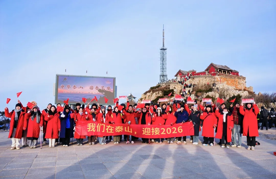2026年1月1日清晨,当新年的第一缕曙光穿透泰山玉皇顶的云海,泰山科技学院数百名师生齐聚海拔1545米之巅,迎接新年朝阳。
