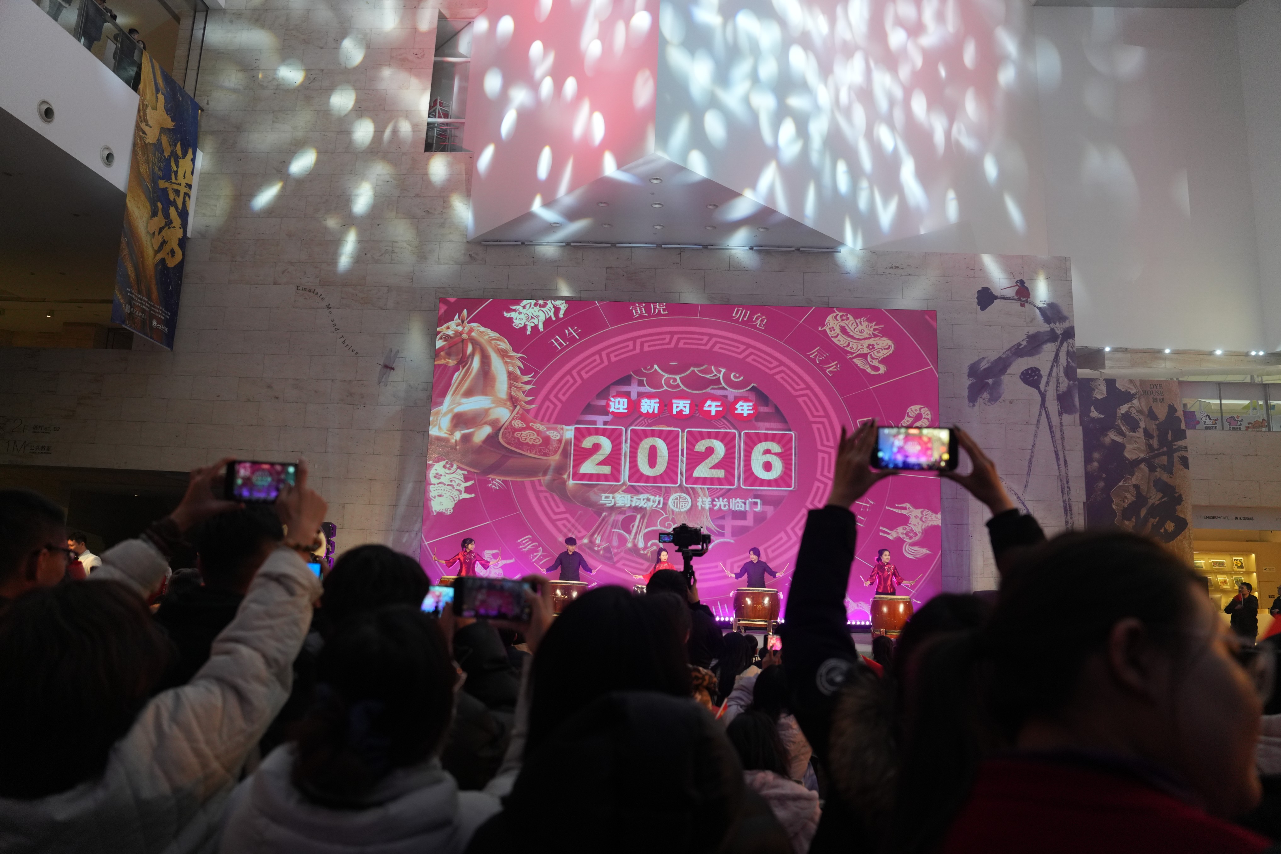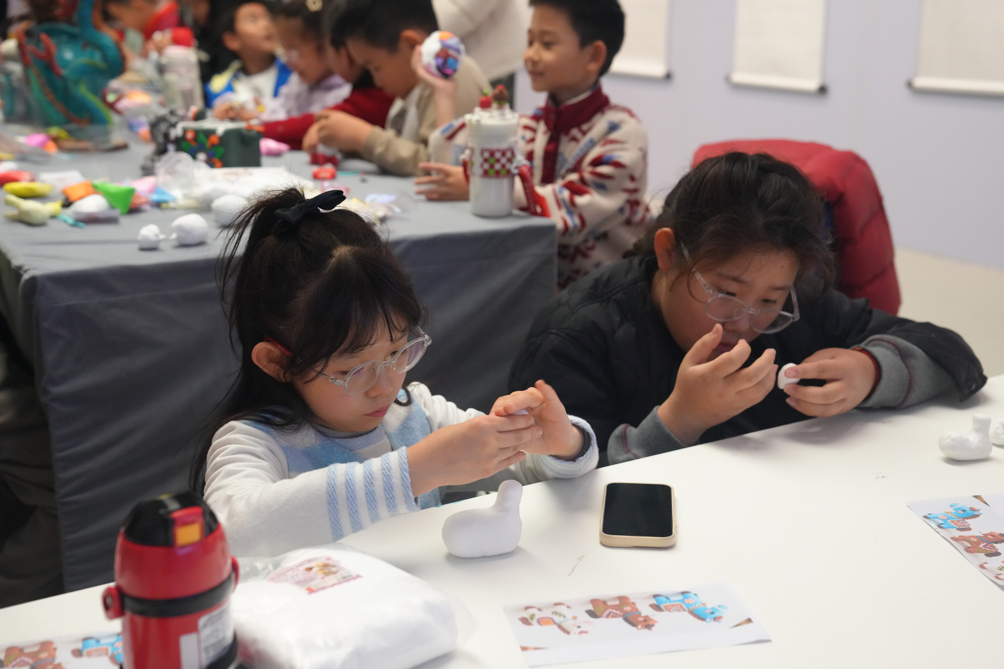 公共服务的柔性升级,是文化惠民的直接体现。美术馆延长开放至凌晨,这一看似简单的运营调整,实则蕴含着文化场馆对公众需求的精准回应,最大限度满足了市民跨年的精神需求。针对不同群体设计的多元活动更显用心:山东非遗文创产品区人气爆棚,淄博琉璃果蔬、潍坊风筝小香包等创意好物,让大师艺术走进日常生活;“童心塑梦,喜迎新年” 主题艺术课程,让 6-12岁儿童以齐白石作品的自然意趣为灵感创作泥塑小马,实现了从“旁观者”到“创造者”的转变;“万竹山居”数字光影、“白石书屋”“白石来信”等互动项目,为传统书画观赏增添了沉浸式趣味,吸引了众多家庭与年轻观众参与;《大染坊》鼓子秧歌表演让人们的心情跟着节拍律动,观众合唱《我和我的祖国》,在零点倒计时与《难忘今宵》的旋律中,共同迎来艺术跨年……