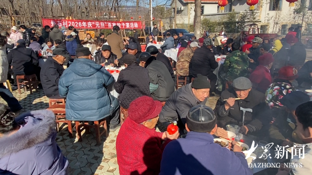 天空湛蓝,白云缕缕。2026年1月1日,济南市南部山区柳埠街道外石村民宿广场上,喧天的锣鼓迎来了村民和游客。广场东边民宿里,村民熊兰芬已经麻利地调好猪肉萝卜粉条的饺子馅,20多位大妈大婶正忙活着包饺子。“今年俺们包了100斤萝卜、35斤土猪肉、10斤粉条,100斤面粉的水饺,得有50多盖垫,保证让村民和游客们吃香、吃饱!”正在擀饺子皮的李政玲说道。