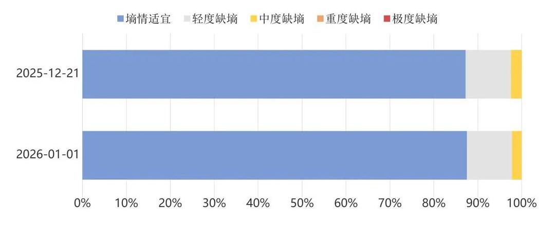 另据统计,截至1月1日8时,全省大中型水库、南四湖、东平湖总蓄水量88.95亿立方米,较常年同期多蓄37.85亿立方米,较去年同期多蓄3.69亿立方米,其中:大中型水库蓄水量63.45亿立方米,较2025年12月下旬旬初减少0.21亿立方米;南四湖蓄水量20.72亿立方米,较12月下旬旬初减少0.06亿立方米;东平湖蓄水量4.78亿立方米,较12月下旬旬初减少0.02亿立方米。