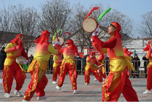 在活动现场,队员们身着鲜艳的传统服饰,手持彩绸、花伞、鼓棒等道具,以饱满的热情,精神抖擞地跳起秧歌。在铿锵有力的锣鼓节奏引领下,队员们迈着矫健的步伐,做出摇、摆、走、跳、扭等一系列动作,变换出丰富多样的队形,充分展示了鼓子秧歌的粗犷豪放与大气磅礴。队员们的精彩表演,赢得现场观众的阵阵掌声。