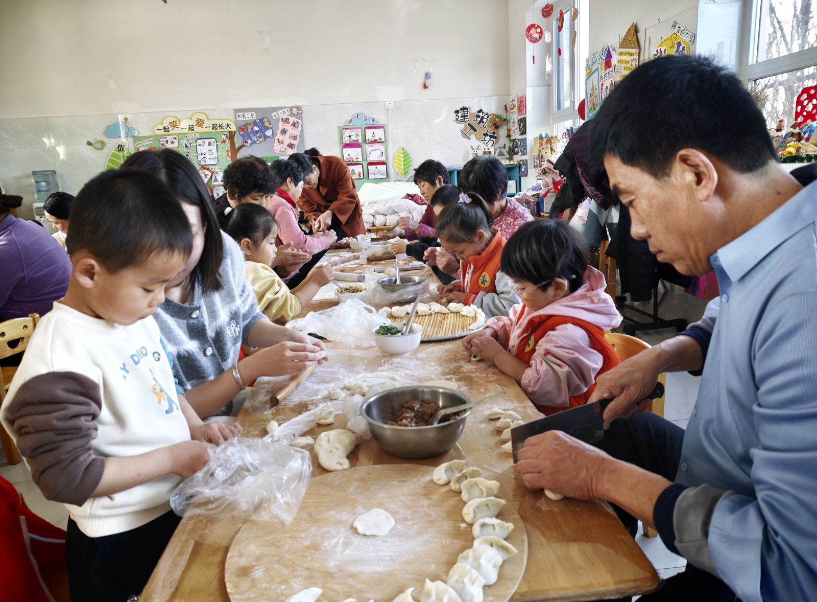 最令人期待的亲子包水饺环节将活动推向高潮。家长们手把手教孩子擀皮、填馅、捏边,孩子们学得有模有样,不一会儿,形态各异的水饺便摆满了托盘。当热气腾腾的水饺端上桌,家长与孩子共同品尝这份亲手制作的美味,温馨的气息弥漫在幼儿园的每个角落......