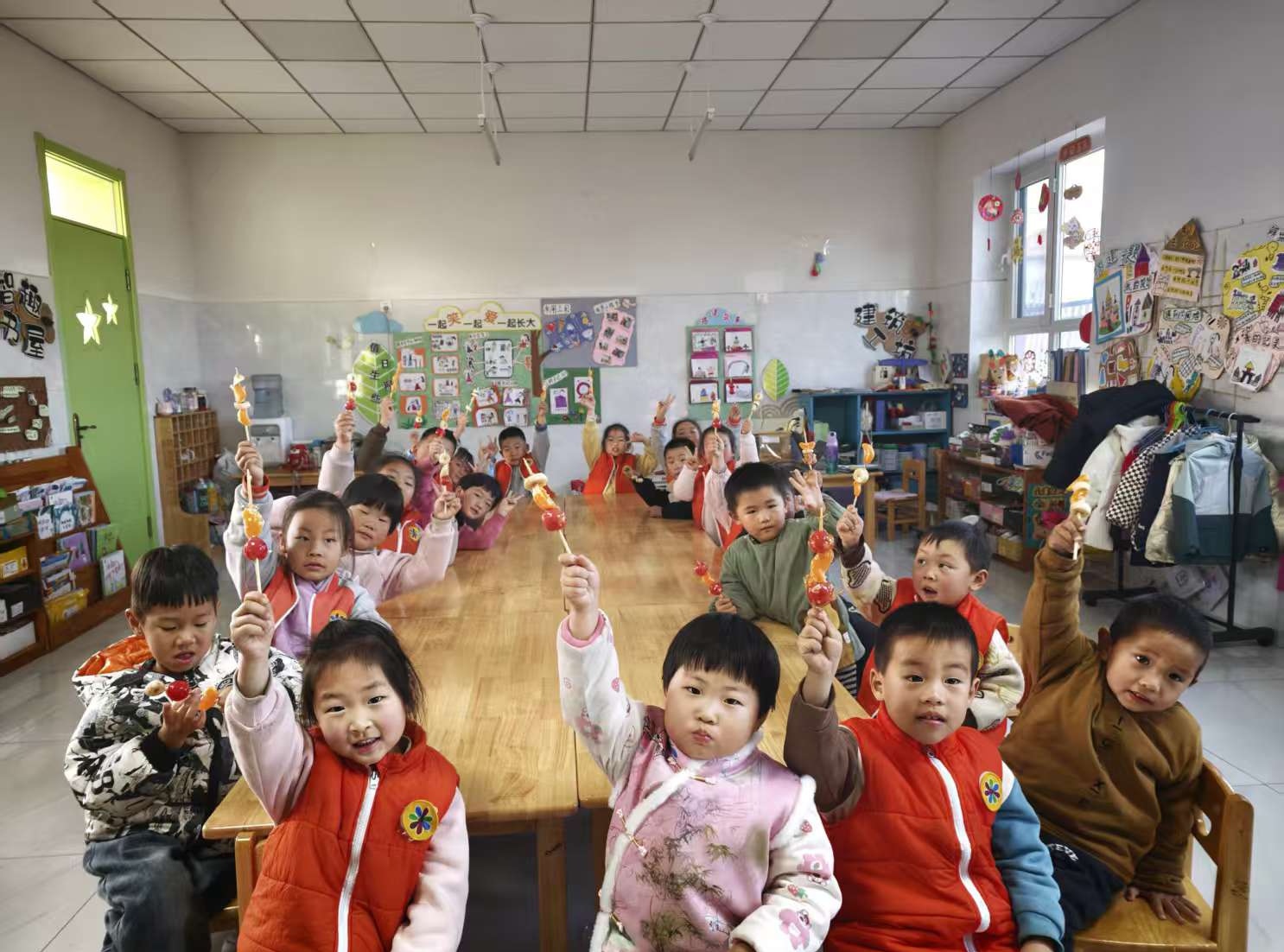 午后的幼儿园依旧热闹非凡,趣味十足的串冰糖葫芦环节如约开启。老师提前准备好新鲜的橘子、香蕉、圣女果等水果,以及竹签、冰糖糖浆。孩子们在老师的协助下,小心翼翼地挑选水果、穿制竹签,一串串造型可爱的水果串很快成型。当熬得金黄的糖浆缓缓浇淋在水果串上,冷却后便成了酸甜可口的冰糖葫芦。孩子们举着自己制作的冰糖葫芦,脸上洋溢着满足的笑容。