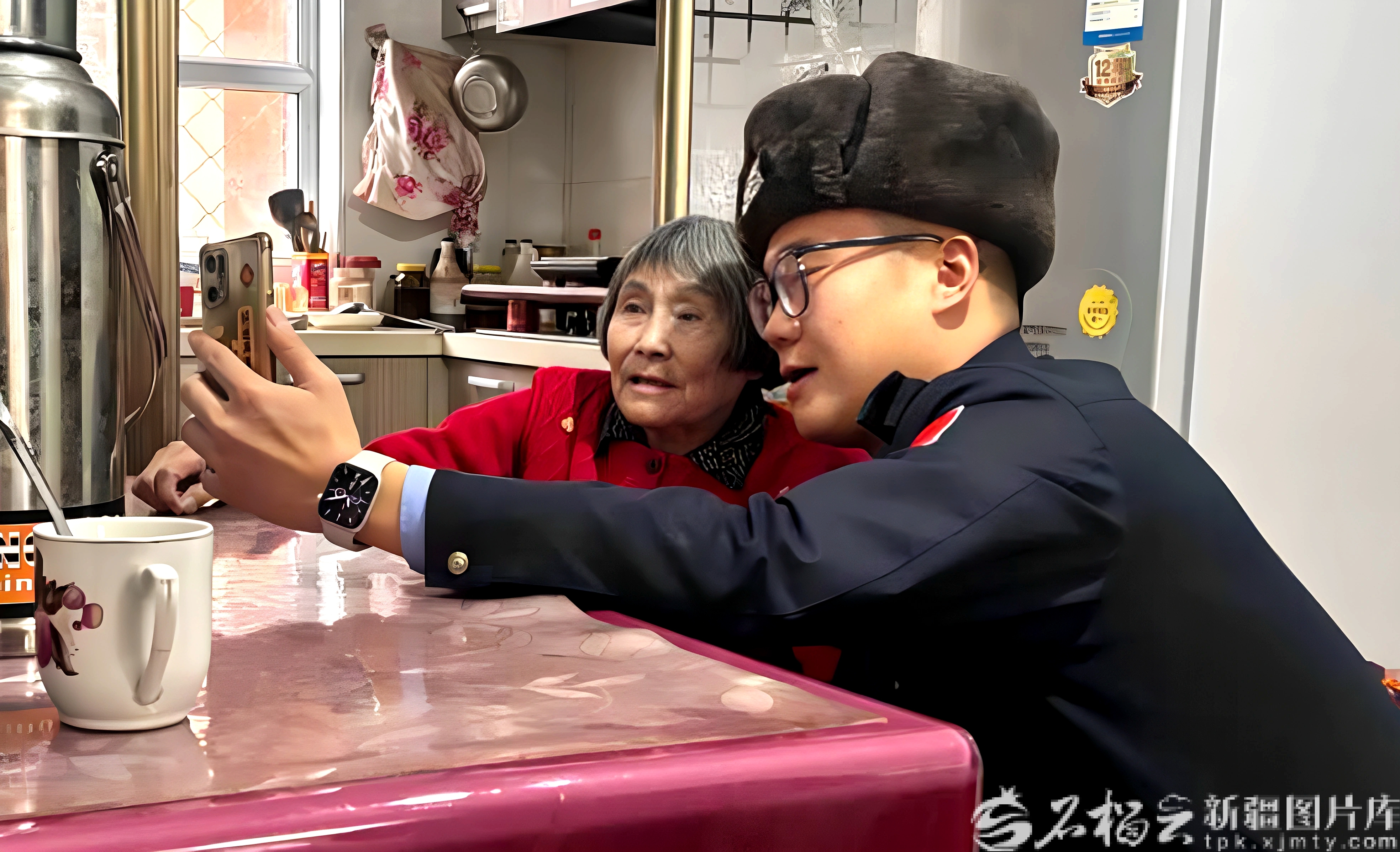 2026年1月1日,伊犁边境管理支队回庄边境派出所民警李燕昭看望孤寡老人吴庆珍,和她拍下2026年的第一张“全家福”。王帅摄