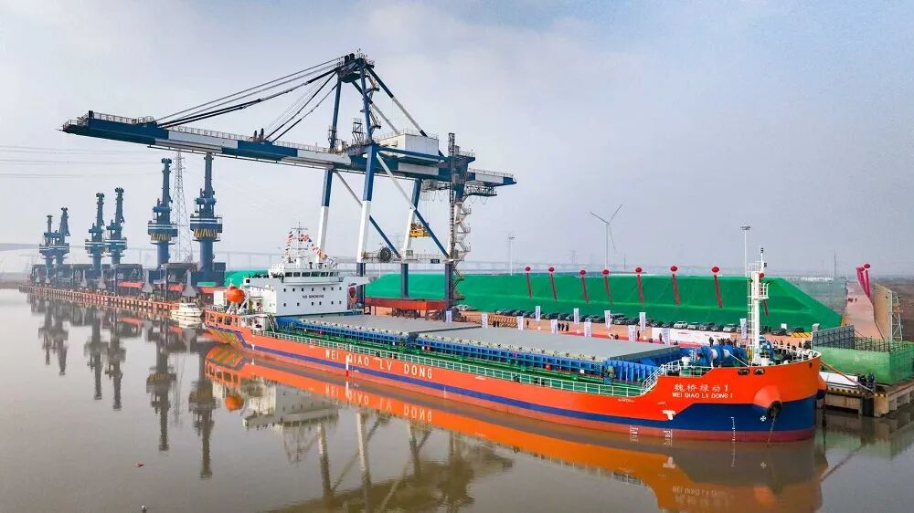 12月29日,全球首艘万吨级近海新能源散货船“魏桥绿动1”轮首航仪式在套尔河港区无棣创业码头举行。董乃德 摄影