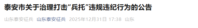 2025年12月31日,泰安市人民政府征兵办公室发布泰安市关于治理打击“兵托”违规违纪行为的公告,详情——