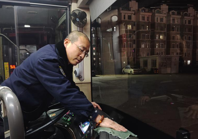 当夜幕降临,城市华灯初上,刘涛完成当天最后一班车驶回场站。检查车辆、填写记录……所有工作结束时,已是万家灯火。