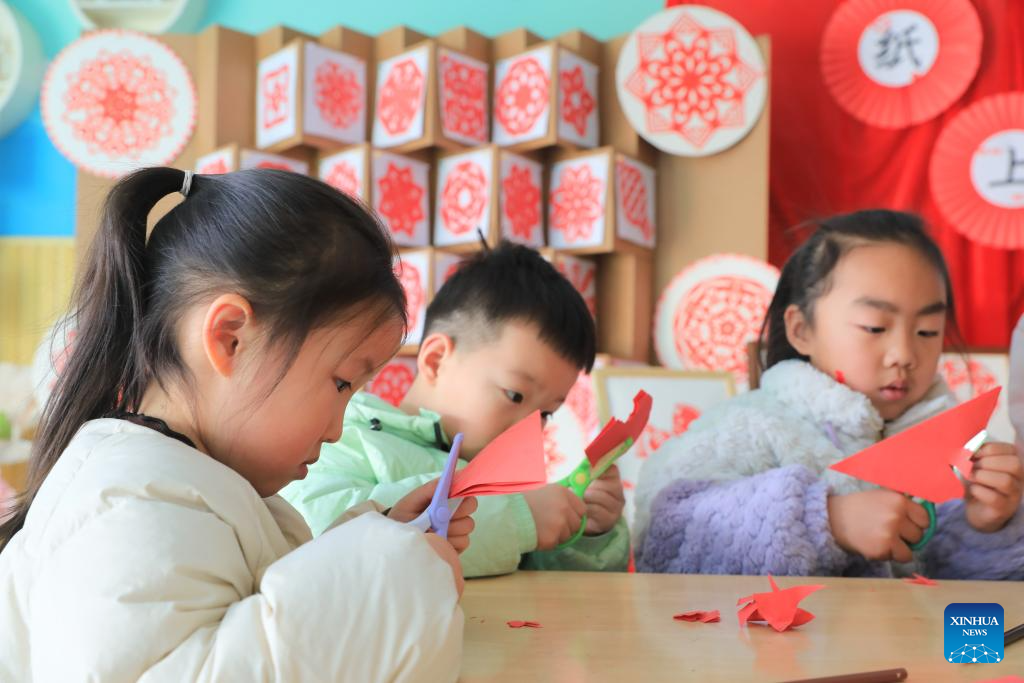 Children make paper-cut decorations in a kindergarten in Jiaozuo City, central China's Henan Province, Dec. 29, 2025. Various activities are held across China to celebrate the upcoming new year. (Photo by Huang Fuxing/Xinhua)