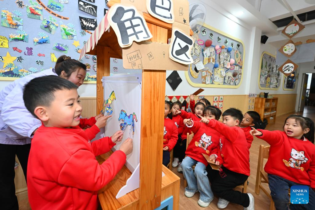 Children make paper-cut decorations in a kindergarten in Dingxi City, northwest China's Gansu Province, Dec. 29, 2025. Various activities are held across China to celebrate the upcoming new year. (Photo by Wang Kexian/Xinhua)