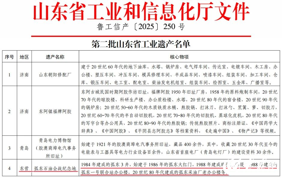 近日,山东省工业和信息化厅公布了第二批山东省工业遗产名单,孤东采油厂孤东石油会战纪念地成功入选。此次入选是对其工业价值与历史意义的高度认可,让这份镌刻着奋斗与奉献的工业记忆,正式跻身省级工业文化遗产的保护与传承行列。