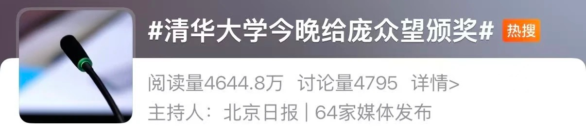 同日,“清华大学给庞众望颁奖”相关话题冲上热搜——