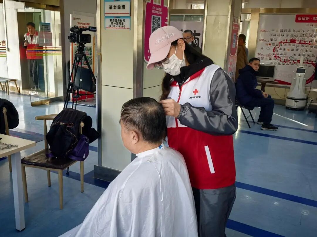 活动现场,还有一位红十字志愿者程亚红女士。她是山东财经大学的老师,常年坚持无偿献血,每周一次为无偿献血者理发已成为她雷打不动的“契约”。目前程老师已经在机采大厅累计志愿服务85次,理发500余人次。