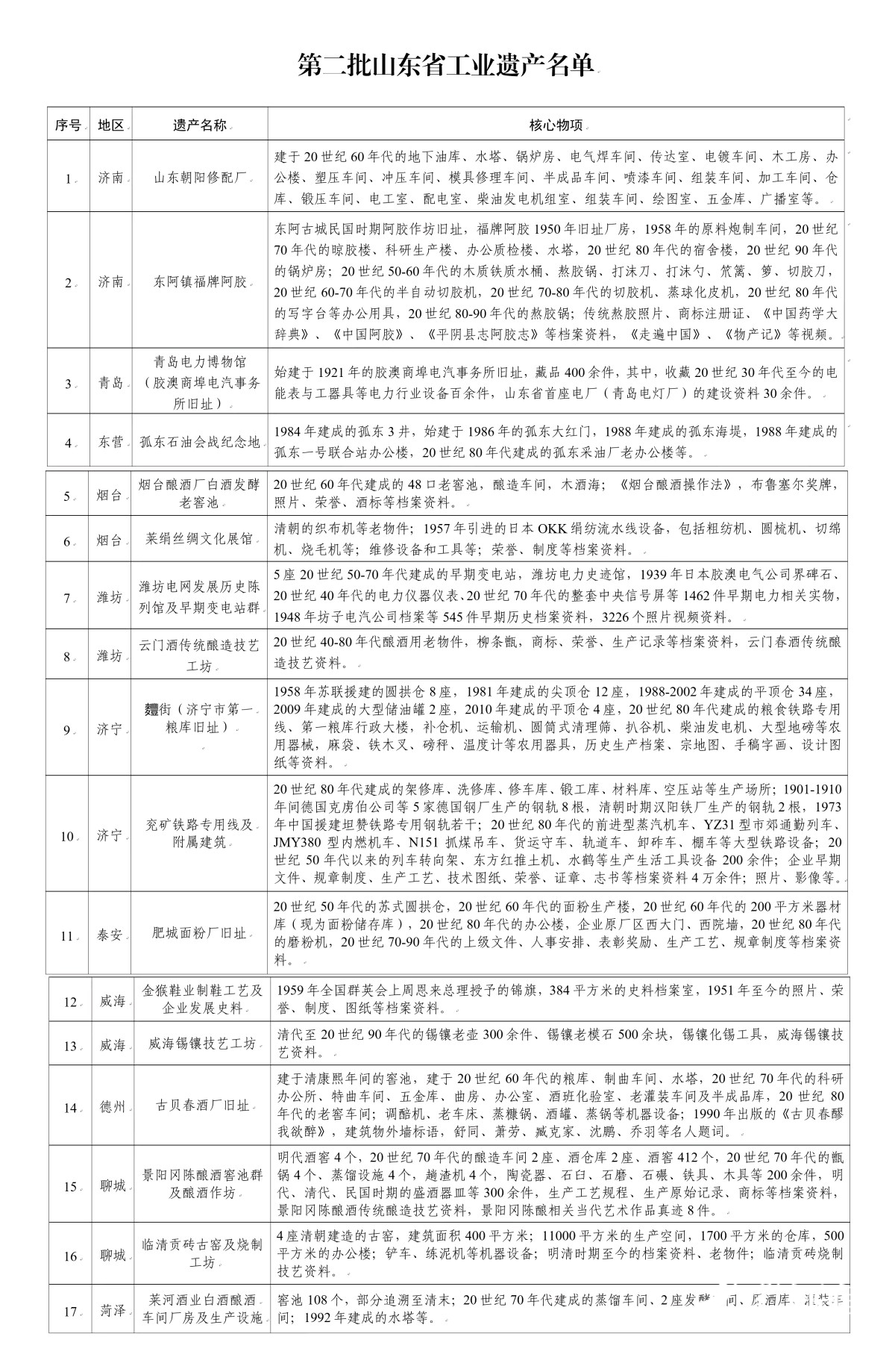 记者从山东省工业和信息化厅了解到,经项目单位自愿申报、所在地县级人民政府同意、各市工业和信息化局推荐、形式审查、专家论证、现场核查、综合评价和网上公示等环节,第二批17家山东省工业遗产名单公布。