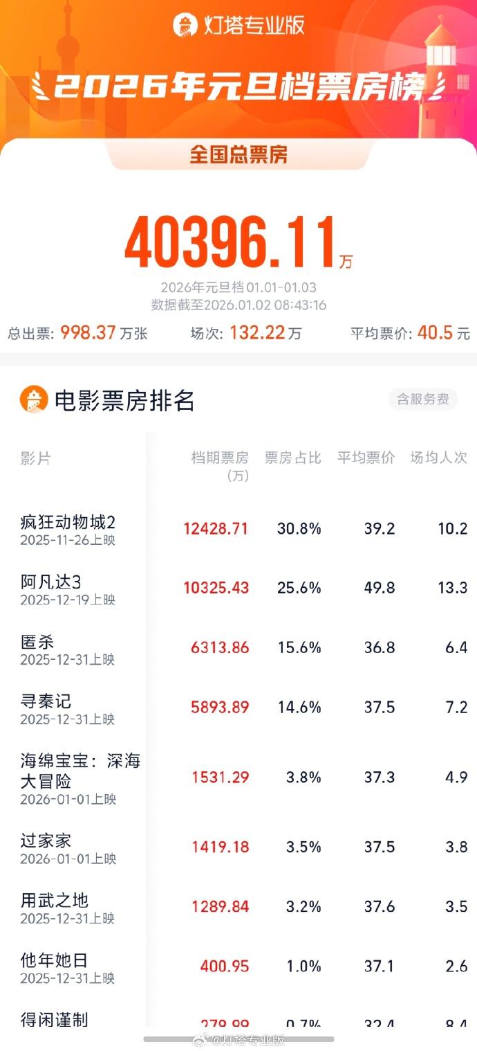据灯塔专业版,截至1月2日8时43分,2026年元旦档(1月1日—1月3日)档期票房(含预售)已突破4亿元,影片《疯狂动物城2》《阿凡达3》《匿杀》暂列档期票房前三名。