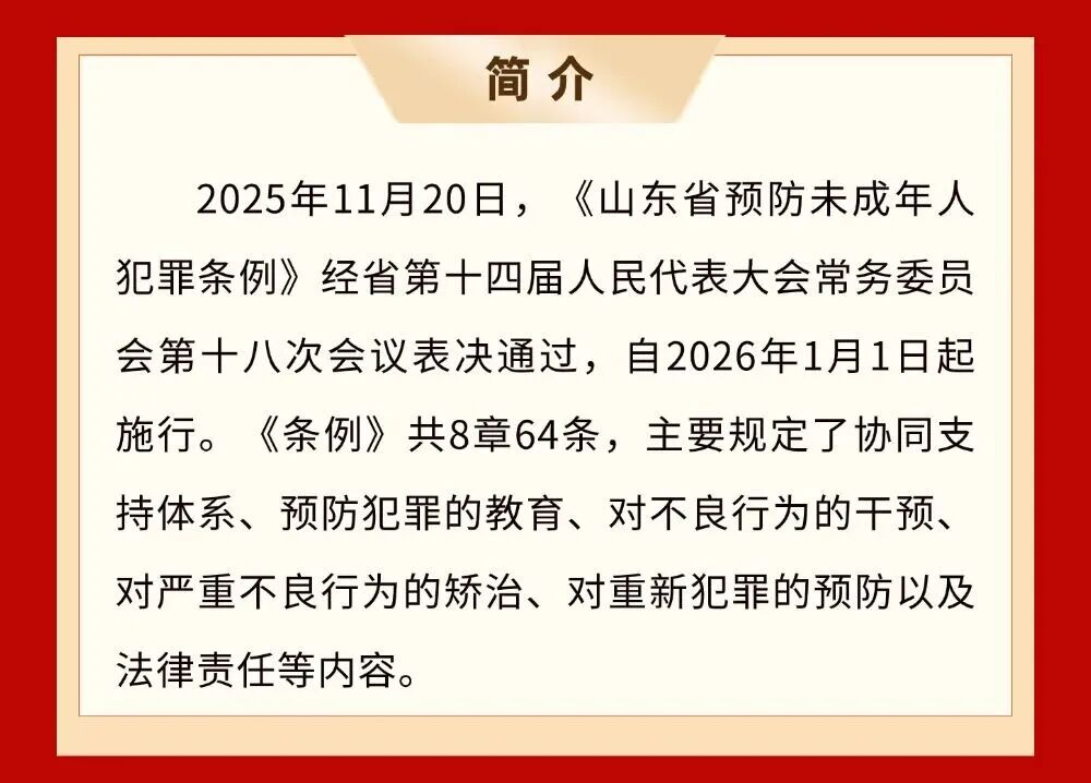 一图读懂!新修订的《山东省预防未成年人犯罪条例》1月1日起正式施行