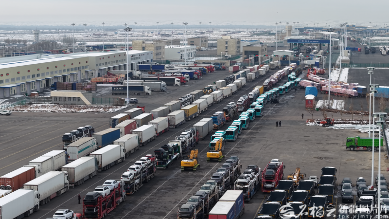 2025年12月26日,在霍尔果斯公路口岸,新能源车、厢式货车等车辆正在排队陆续从此出境,前往哈萨克斯坦。董智杰 摄