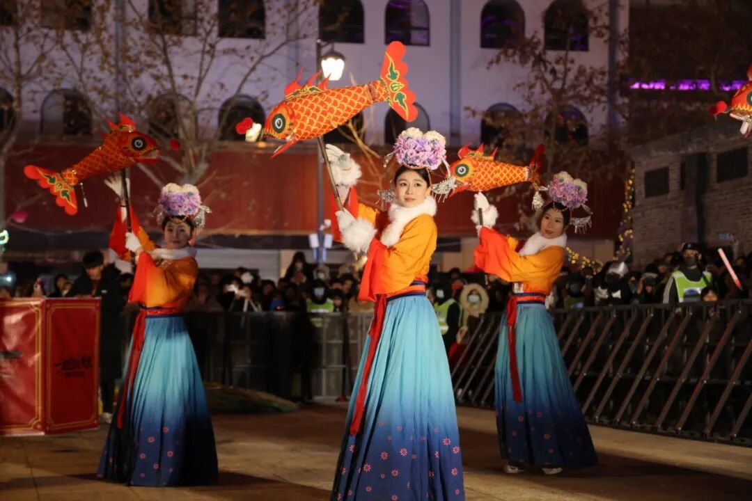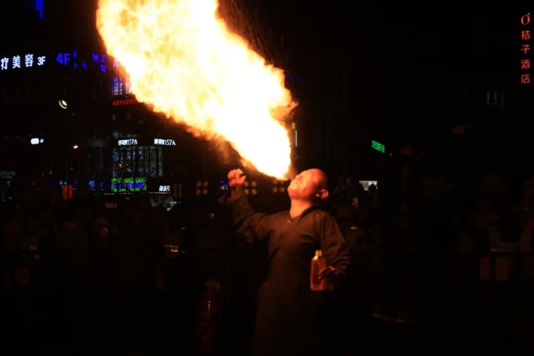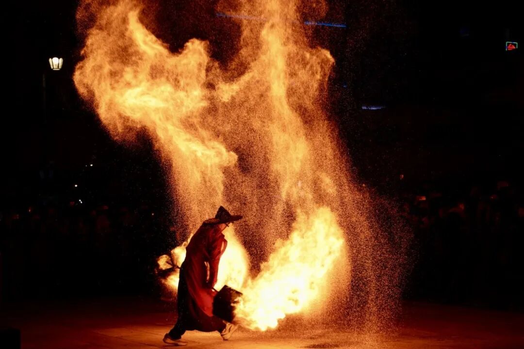 当晚,真正的人气焦点,莫过于非遗表演了。火壶表演者手持特制铁壶娴熟抖动,滚烫火星四溅升腾,如漫天星火坠落;惊险震撼的“吐火”表演紧随其后,表演者气沉丹田,火光骤然喷薄而出;充满童趣与喜庆的盒子灯表演中,造型别致的花灯次第“绽放”,每一盏都藏着对新年的美好祈愿;非遗鱼灯巡游环节,队伍循着街巷缓缓穿梭,鱼灯“摇曳生姿”,尽显古韵浪漫。