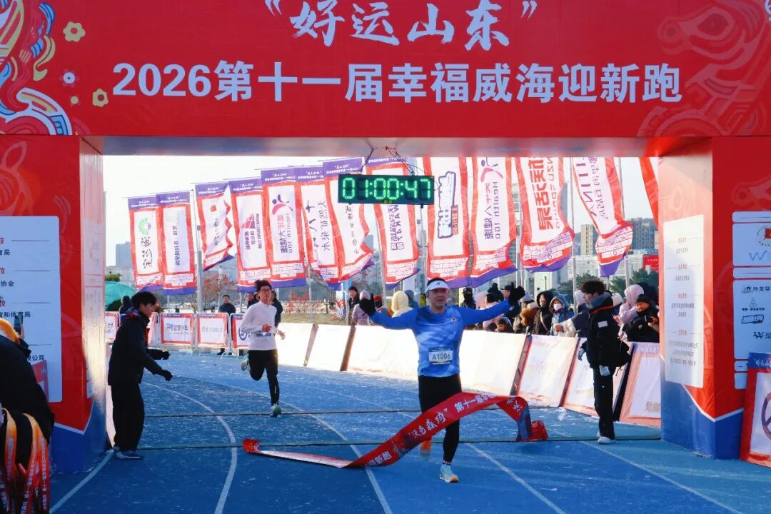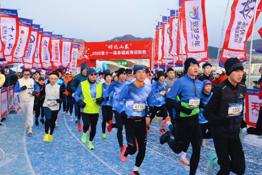 不远处的至海港湾大操场同样热闹非凡,“好运山东”2026年第十一届幸福威海迎新跑在这里鸣枪开跑。跑步爱好者们迈着矫健的步伐冲出起点,沿着既定路线奋力奔跑,用活力与激情诠释对新年的美好期许。赛道旁,加油声、呐喊声此起彼伏,现场氛围热烈十足。