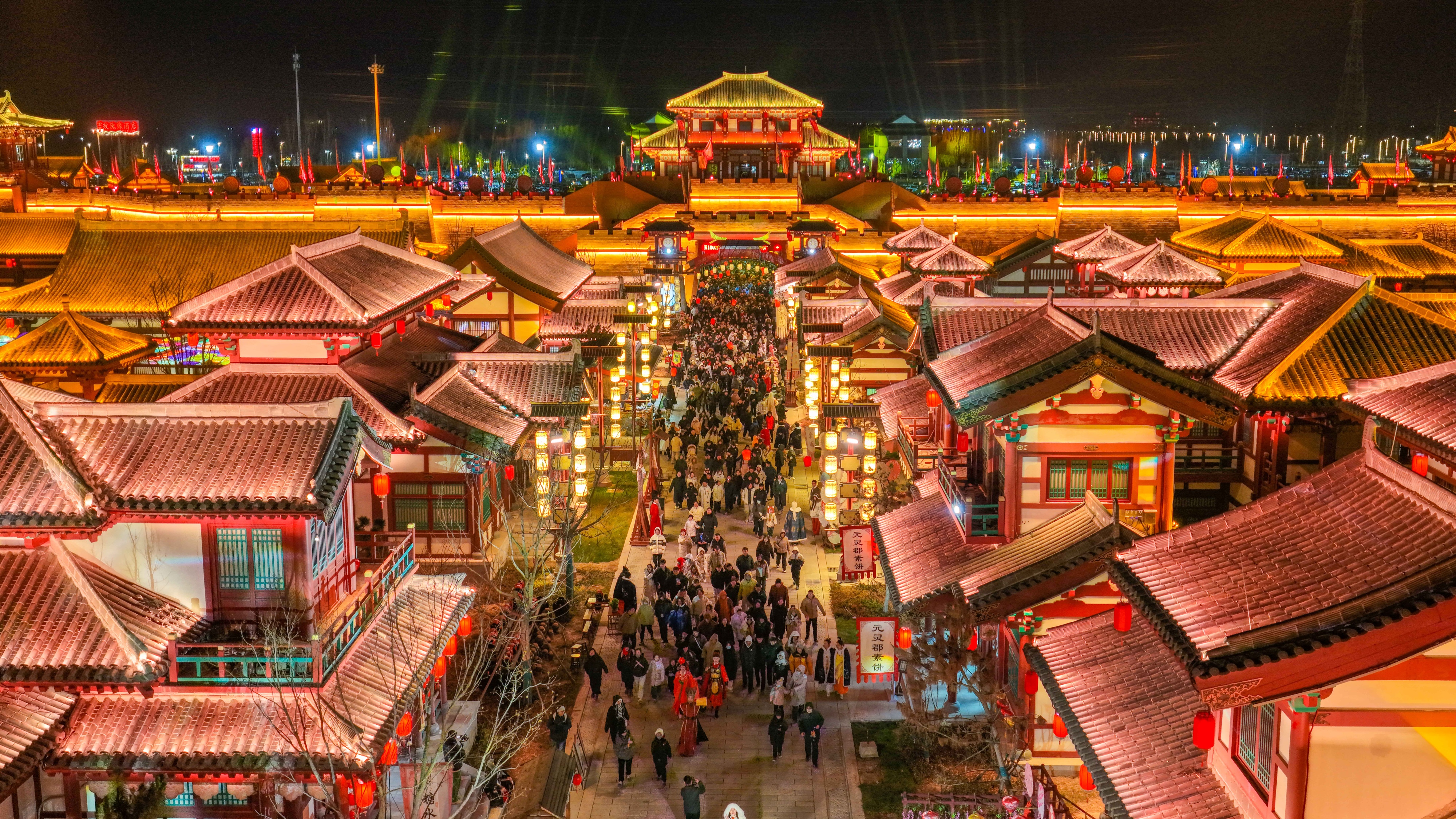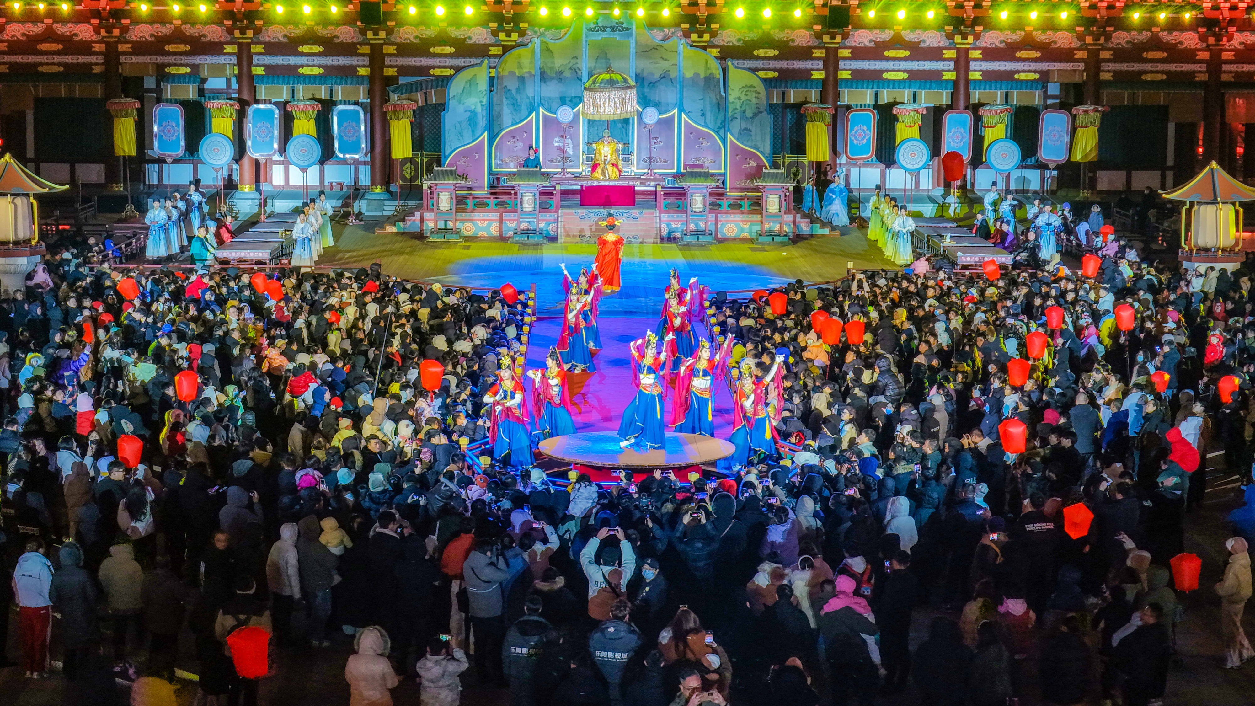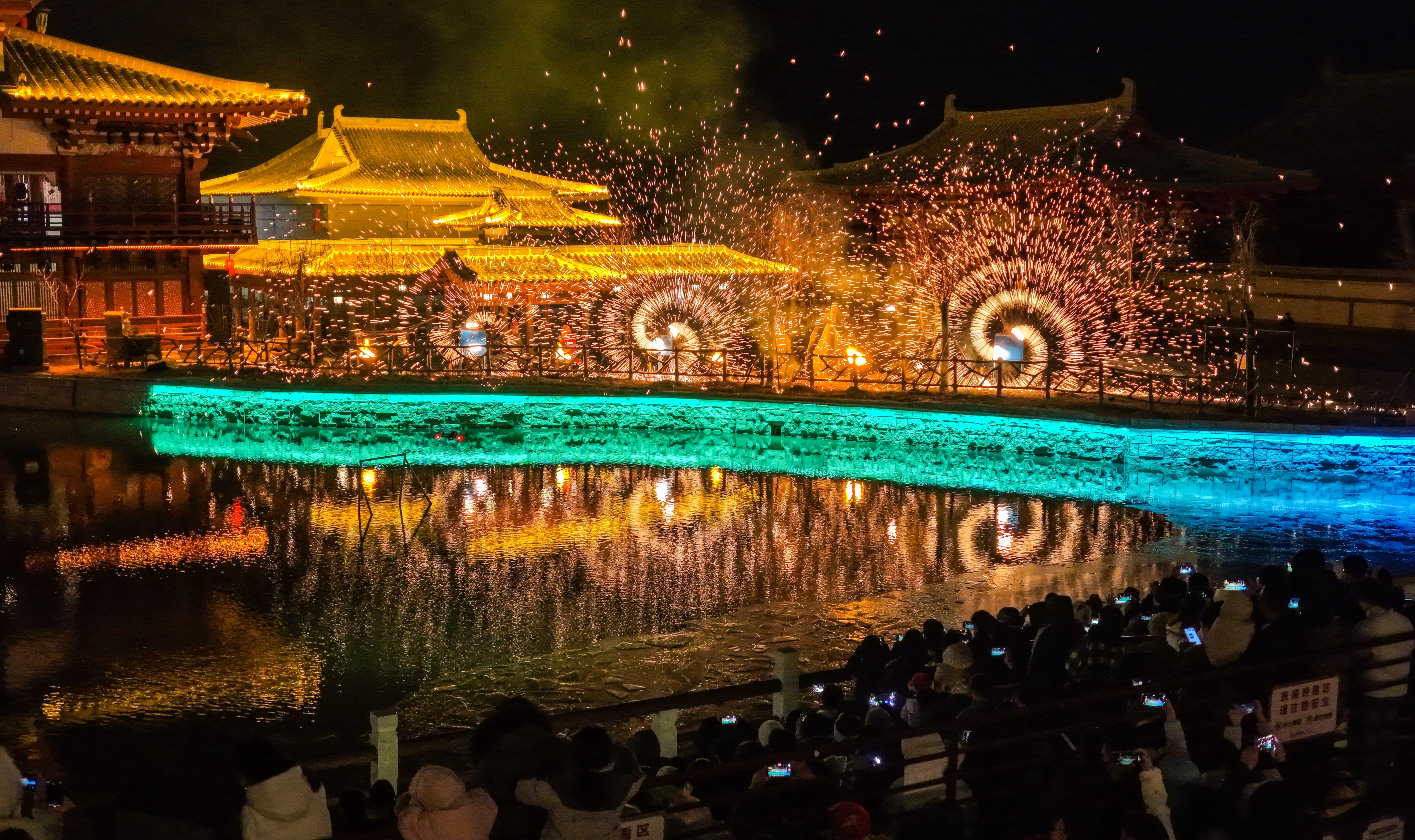 夜幕降临,乐陵影视城真正的“大戏”才刚刚开始。城内盛唐风格的市井街巷与现代光影交相辉映,游客漫步其中,瞬间感受“穿越古今”的沉浸感。无人机表演、烟花秀、非遗打铁花、孔明灯放飞精彩上演,游客纷纷举起手机记录,快门声与欢呼声此起彼伏,成为元旦夜游的“高光时刻”。