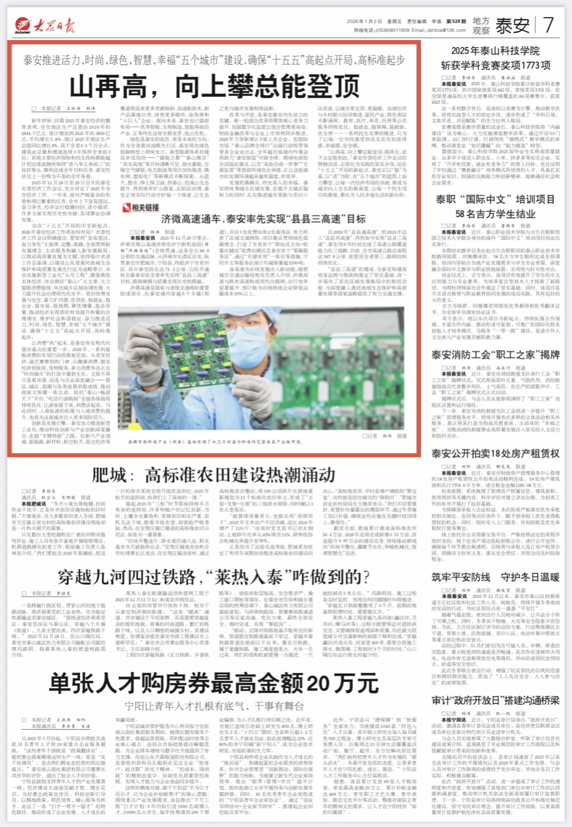 1月2日,大众日报《泰安新闻》推出重磅策划《山再高,向上攀总能登顶》,聚焦泰安市委经济工作会议:2025年泰安经济交上一份殊为不易的全年答卷,站在“十五五”开局的历史新起点,2026年泰安要坚持“登高望远、奋力争先”主旋律,以推动高质量发展为主题,以建设山东省黄河流域生态保护和高质量发展先行区为战略牵引,突出实施新型工业化“头号工程”,突出做好“泰山+”大文章,突出城乡区域协调发展,奋力推进活力、时尚、绿色、智慧、幸福“五个城市”建设,确保“十五五”高起点开局、高标准起步。详情请点击这里—