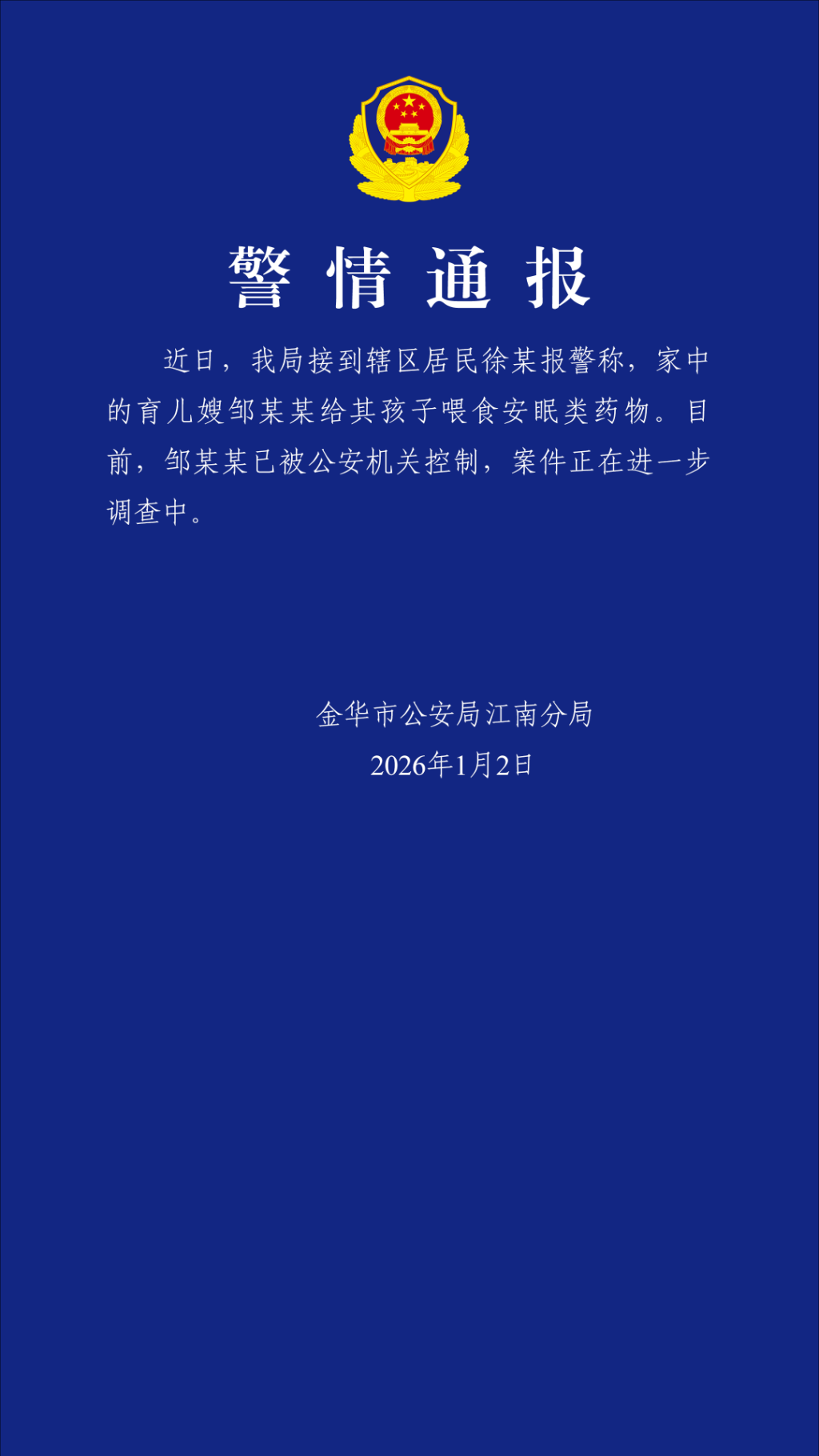浙江金华警方:育儿嫂邹某某给孩子喂食安眠类药物,已被控制