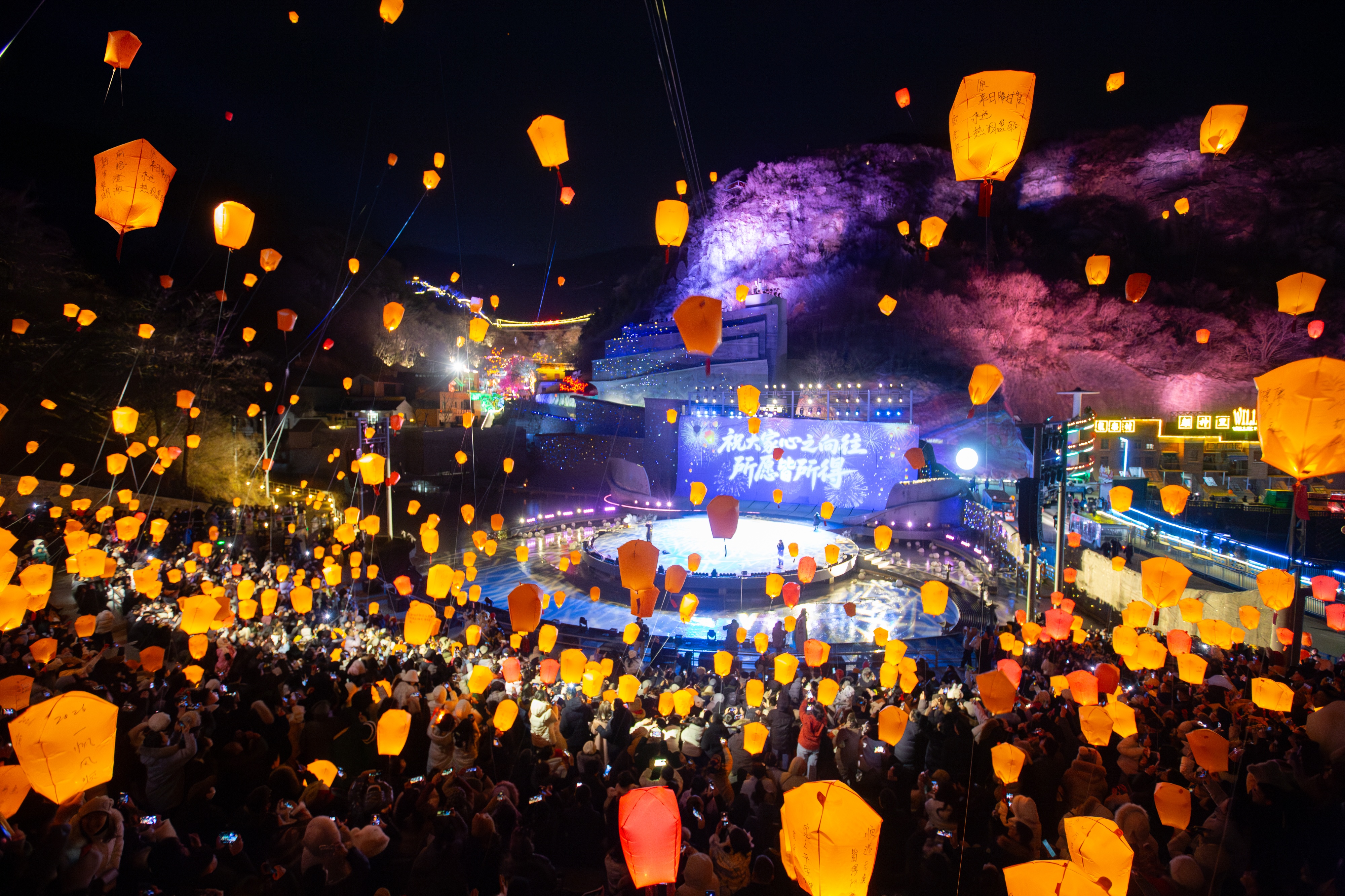 跨年夜,“家人安康,顺遂无虞”的祈愿,同三千明灯一起缓缓升上淄博红叶柿岩的夜空。景区里一盏盏手写祝福的祈福花灯,载满游人的期盼,伴随漫天绽放的烟花,将新年的夜空点缀得华光流转、如梦如幻。
