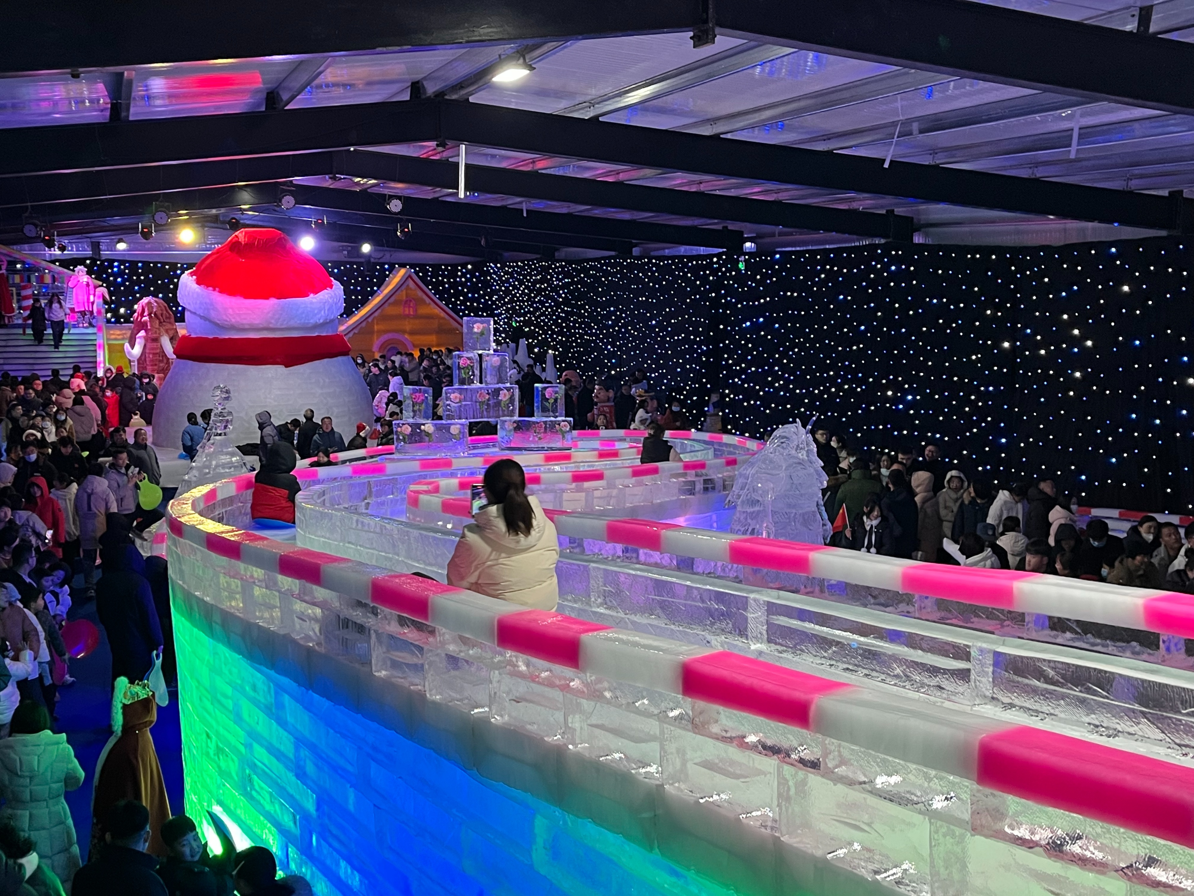 这种“冰雪+主题”的创意,在古城景区同样开花结果。在郓城县水浒好汉城,一座占地近2000平方米的冰雕馆成为元旦新晋“顶流”。冰雪城堡、巨型雪人、旋转滑梯等冰雪场景每天吸引近3万人打卡。