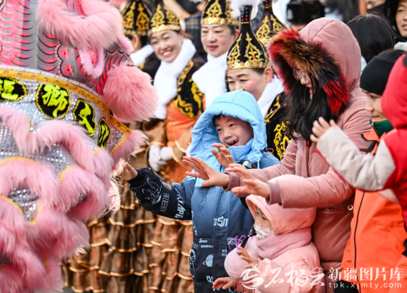 1月1日,在大巴扎步行街,舞狮与小朋友们热情互动。米热扎提·木塔力甫摄