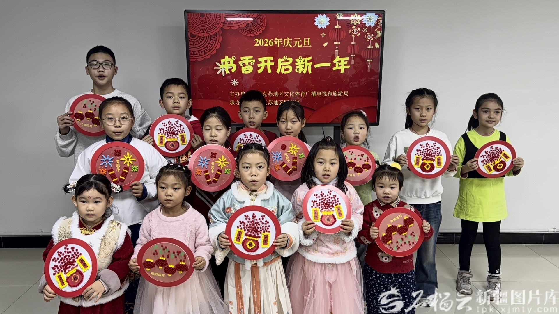 同一天,阿克苏地区图书馆举办了“庆元旦·书香开启新一年”阅读推广活动,吸引了25组亲子家庭热情参与。活动伊始,亲子共读分享环节温情启幕。5组亲子家庭轮番登台,分享了《门神的故事》《愚公移山》《帅帅的漂亮毛衣》等经典绘本,还带来了诗歌朗诵《元旦》《新年,你好!》。小朋友们语速稚嫩却饱含深情,结合绘本画面生动讲述故事细节,家长们在一旁默契配合、适时补充,既有童真童趣的表达,也有对故事背后道理的浅显解读,现场气氛温馨而热烈。随后,元旦·毛球画手工制作环节点燃全场热情。在家长的耐心协助下,小朋友们充分发挥想象力与创造力,手持色彩斑斓的毛球,动手拼贴、创意组合,将对新年的美好期许融入指尖创作。一幅幅充满童趣的元旦主题作品新鲜出炉。