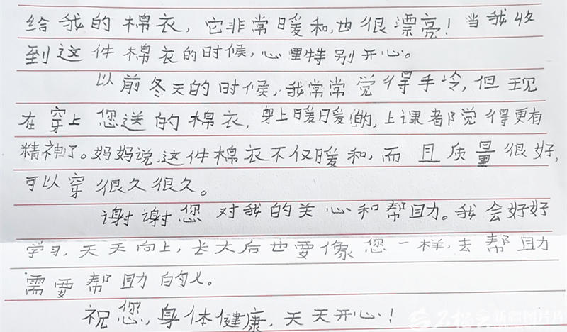 捐赠现场,拉齐尼小学三年级学生帕合热亚·赛力木说:“大海边的叔叔阿姨,羽绒服既合身又暖和,谢谢你们。”
