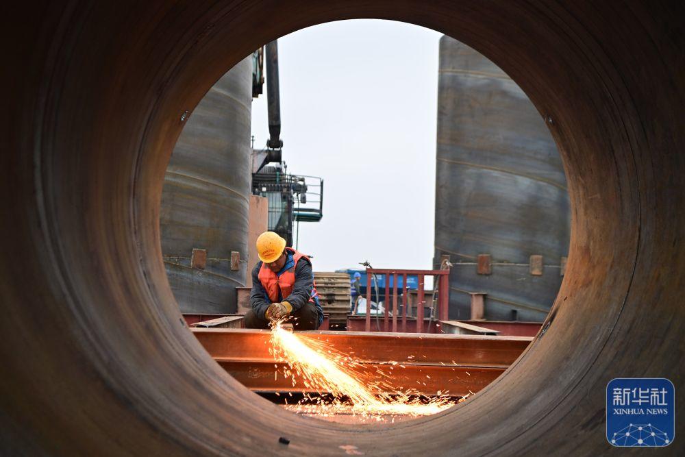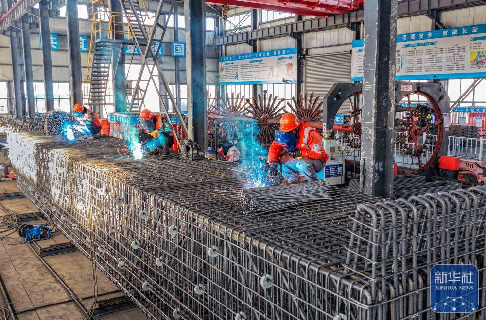 ↑ 1月2日,工人在位于江苏省兴化经济开发区的中建七局宁盐高速泰州1标段钢筋加工场进行焊接作业(无人机照片)。新华社发(周社根摄)