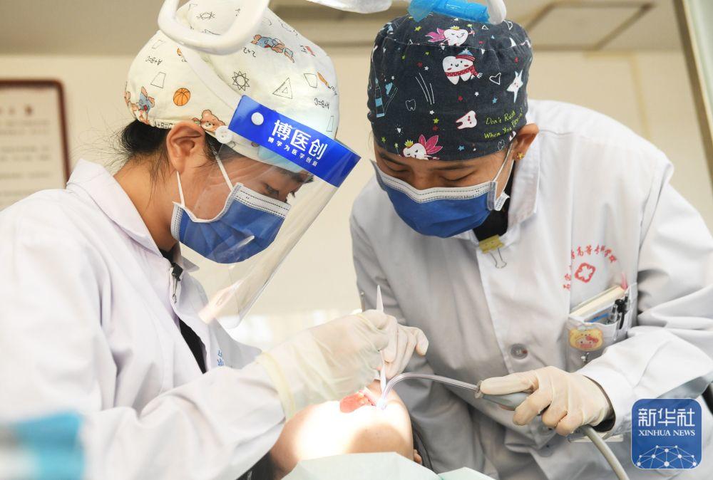 ↑ 1月2日,在河北省石家庄新乐市一家医院,医生给患者修复牙齿。新华社发(贾敏杰摄)