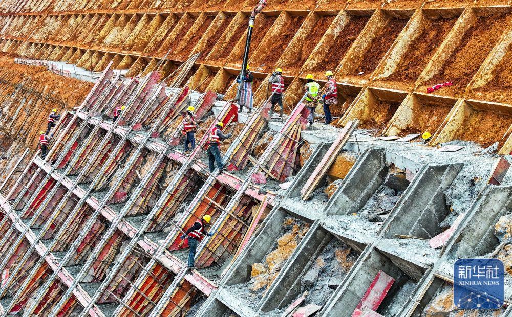 ↑ 1月2日,在位于湖南省永州市新田县龙泉街道石甑源村的桂(东)新(田)高速建设工地,工人们进行防护坡施工作业(无人机照片)。新华社发(刘贵雄摄)