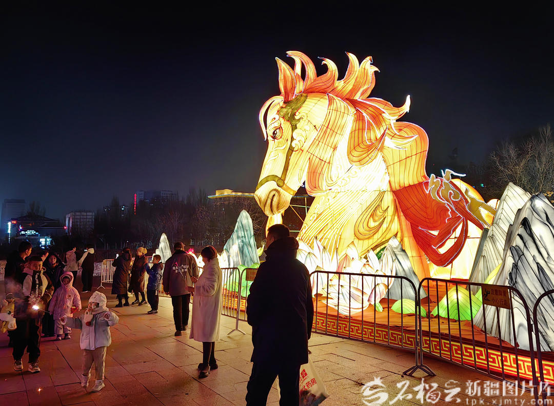 南湖市民广场展区堪称本次花灯展的“人气担当”,灯组设计将新疆地域风情与创意巧思完美融合。在广场西门空地的核心灯组“一马当先”格外夺目,这座高7米、长20米的巨型灯组,以灵动的生肖马形象为核心,巧妙融入天山、雪莲、山川湖泊等新疆标志性元素。灯组还暗藏科技巧思,马眼处搭载动态特效,每隔1至15秒便会自动眨动,灵动传神的模样引得游人纷纷驻足,用镜头定格下这独具特色的光影瞬间。