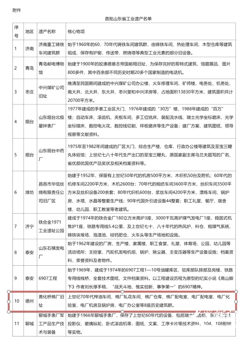 此外,在2023年12月27日公布的首批山东省工业遗产名单中,德州报送的善化桥棉厂旧址入选。