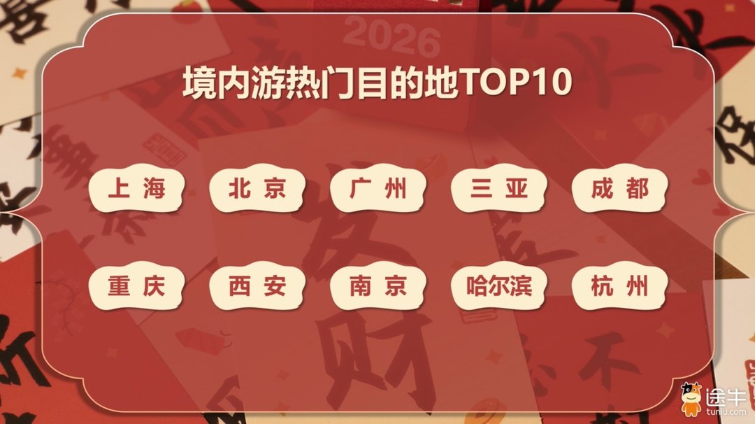 除打包旅游产品外,元旦假期机票、酒店、高铁票等单项产品预订热度同步攀升。一线及新一线城市用户“打飞的跨年”需求旺盛。其中,北京至上海、北京至广州、北京至成都、成都至上海、上海至北京等航线成为途牛用户的热门选择。